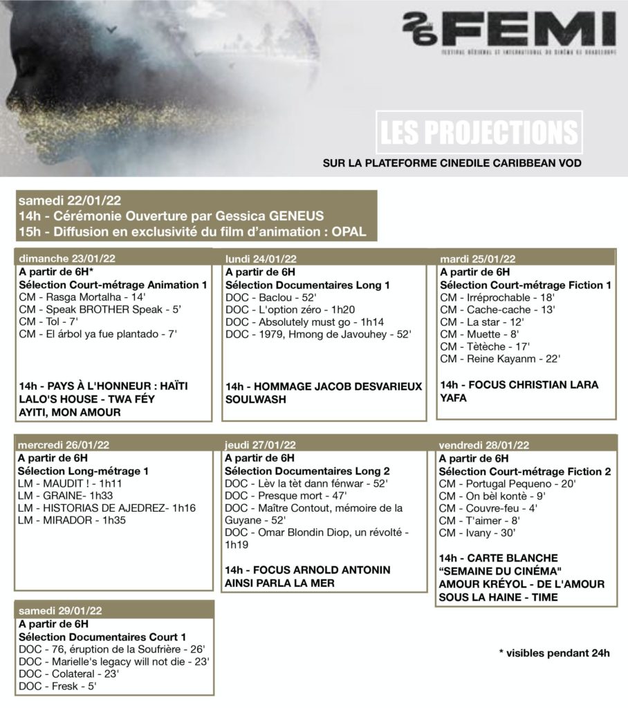 Ainsi, du 22 au 29 janvier, le festival de cinéma de la Guadeloupe se fera entièrement en ligne avec des projections de films et des web-conférences sur la plateforme Cinédile Caribbean VOD ainsi que sur les réseaux sociaux du Fémi (Facebook et Instagram).