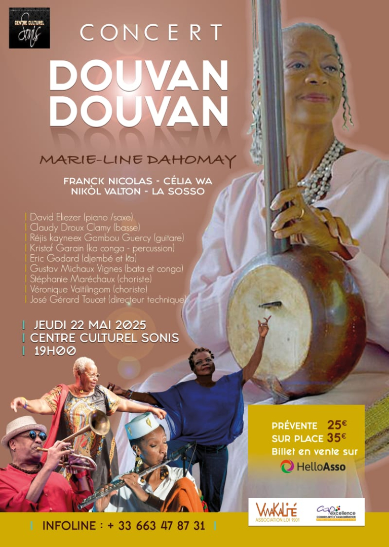 The “Douvan, Douvan” concert will take place on May 22, 2025 at 7:00 pm at the Sonis Cultural Center in Les Abymes.