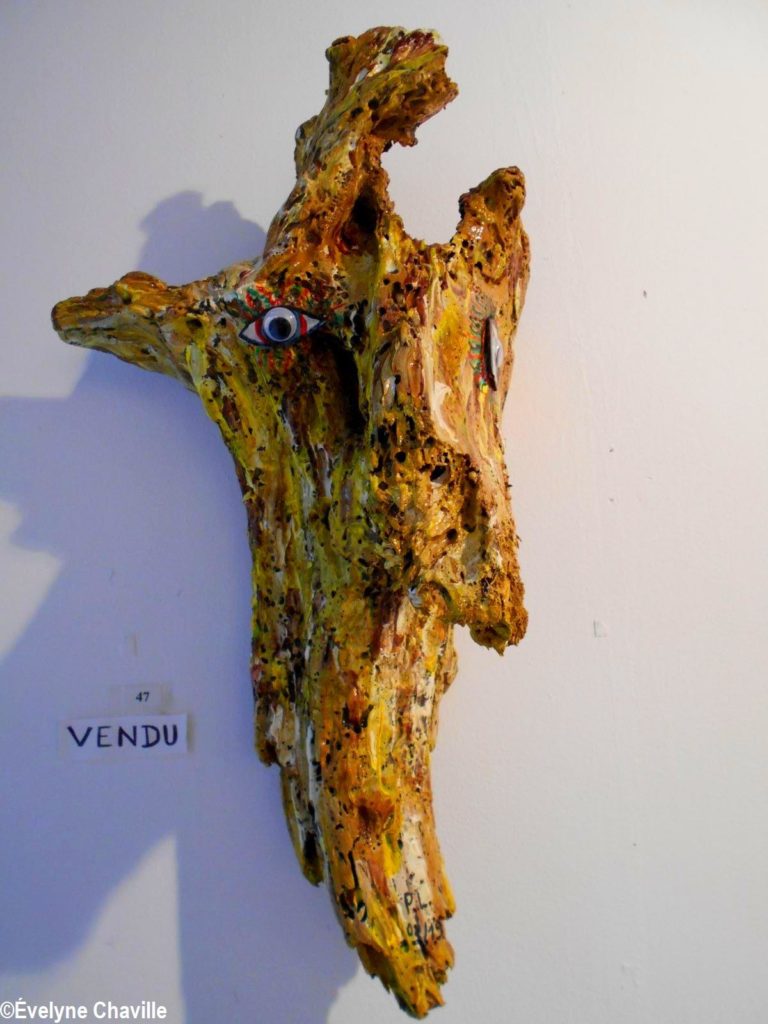 For this exhibition-sale, the artist had named his stand “Nature and Artistic Creation”. Our first observation was, according to Patricia Lollia, the pieces of wood and roots that many of us would be ready to put at the waste collection centre are worth gold. Thanks to her overactive imagination, the visual artist manages to sublimate them and give them a new life in our living-rooms. “I picked up the smallest pieces of driftwood (and a coral with natural purple hues) that allowed me to create these works on La Datcha beach in Le Gosier after Hurricane Maria. The biggest pieces of wood, I found them in Saint-Félix, in the town of Le Gosier too. Some roots come from my garden. The element gives you the subject. Through his imagination, his creativity the artist does not only see a ordinary piece of wood, he will see something else, a masterpiece”, she explained.