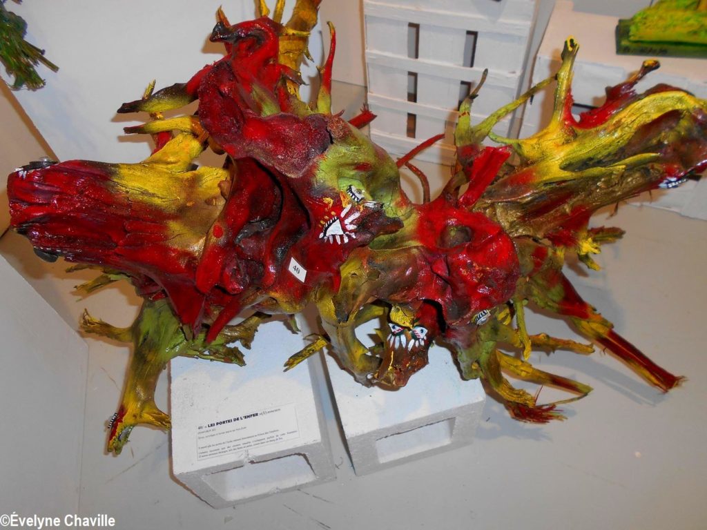 She did not have any special processing to do to prepare the driftwood and roots, they were painted with acrylic paint. It took Patricia Lollia three months to build this collection of forty pieces.