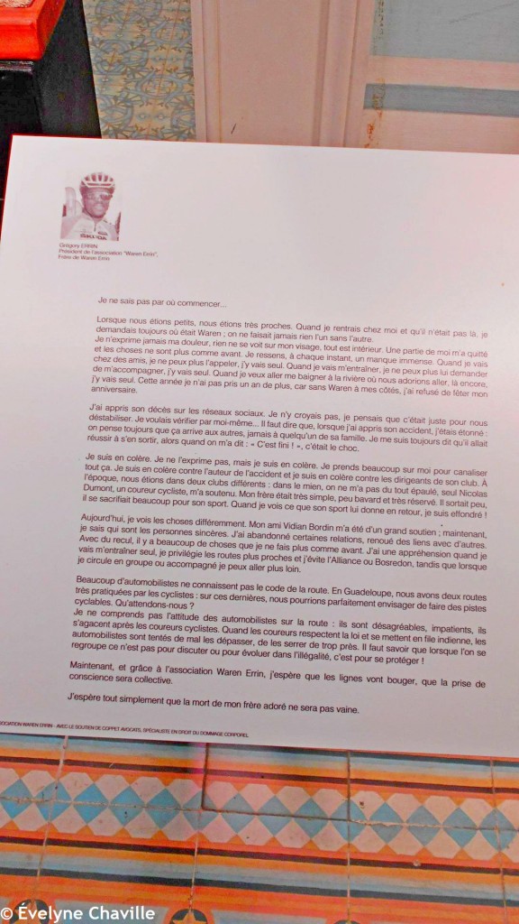 Es difícil decir que la exposición “57″ – que tiene lugar del 25 al 30 de septiembre de 2017 en el Pavillon de la Ville en Pointe-à-Pitre – es magnífica porque el tema que aborda es grave y triste. En efecto, en 2016, 57 personas perdieron la vida en las carreteras de Guadalupe. Entre estas víctimas había el joven ciclista Waren Errin (22 años), quien fue atropellado por un coche cuando iba a complir una formalidad al velódromo de Baie-Mahault con el fin de participar en la Vuelta ciclista internacional a Guadalupe.