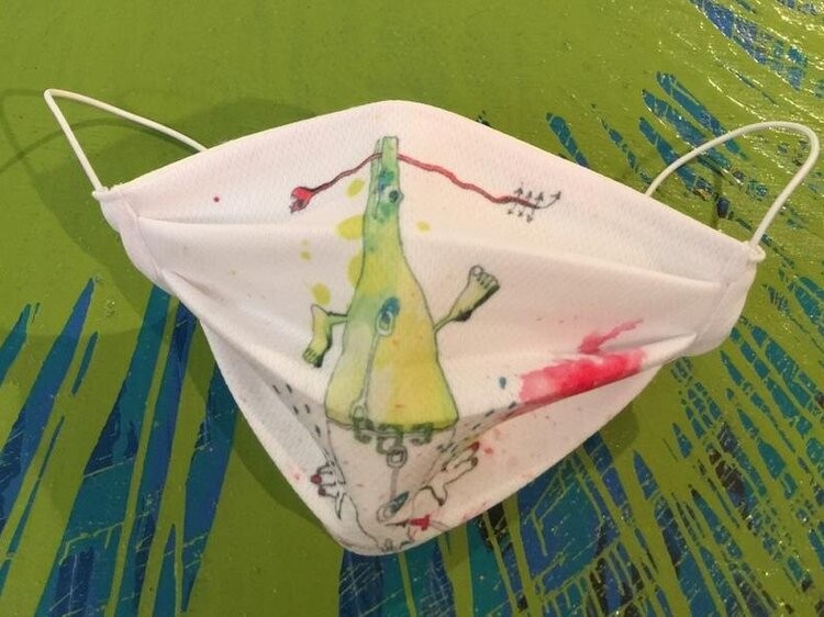 El pintor guadalupeño Thierry Alet decidió así fabricar “localmente” máscaras que reproducen una veintena de sus obras extraídas de las series tituladas “Manuscritos”, “Splash”, “Los animales”, así como un detalle de un dibujo digital realizado durante el confinamiento. El artista también ha dado un toque de humor a una de sus creaciones que deforma y hace crecer la nariz y la boca de la persona que la lleva… Otras máscaras se inspiraron en los dibujos de su hija de siete años, incluyendo una para un niño.