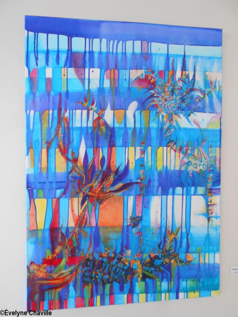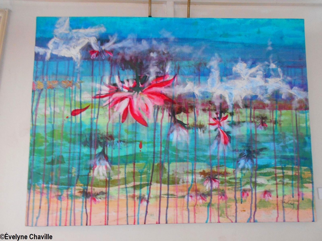 El azul predomina en “Les Féeries de Lilie”. A propósito de esta elección, la pintora dice: “es un color que tiene infinitos matices, es el color de la armonía y la paz”. Con esta pintura acrílica, utilizó como técnicas, por primera vez, “goteo” y colaje. “Con el arte, siempre hacemos un trabajo sobre nosotros mismos, el medio trajaba para usted. Cuando comienzo una pintura, es el medio que me dirige. Pienso mucho antes de pintar, investigo, recorto los materiales que añadiré a la obra. Durante estas largas vacaciones escolares, fui a Paray-le-Monial, en Borgoña, visité una magnífica exposición de mosaicos, algunos detalles me inspiraron para los gradientes y los colores”, dice Valérie Marteel.
