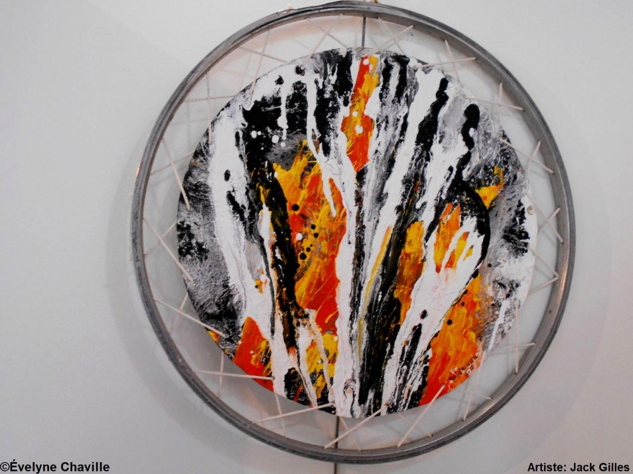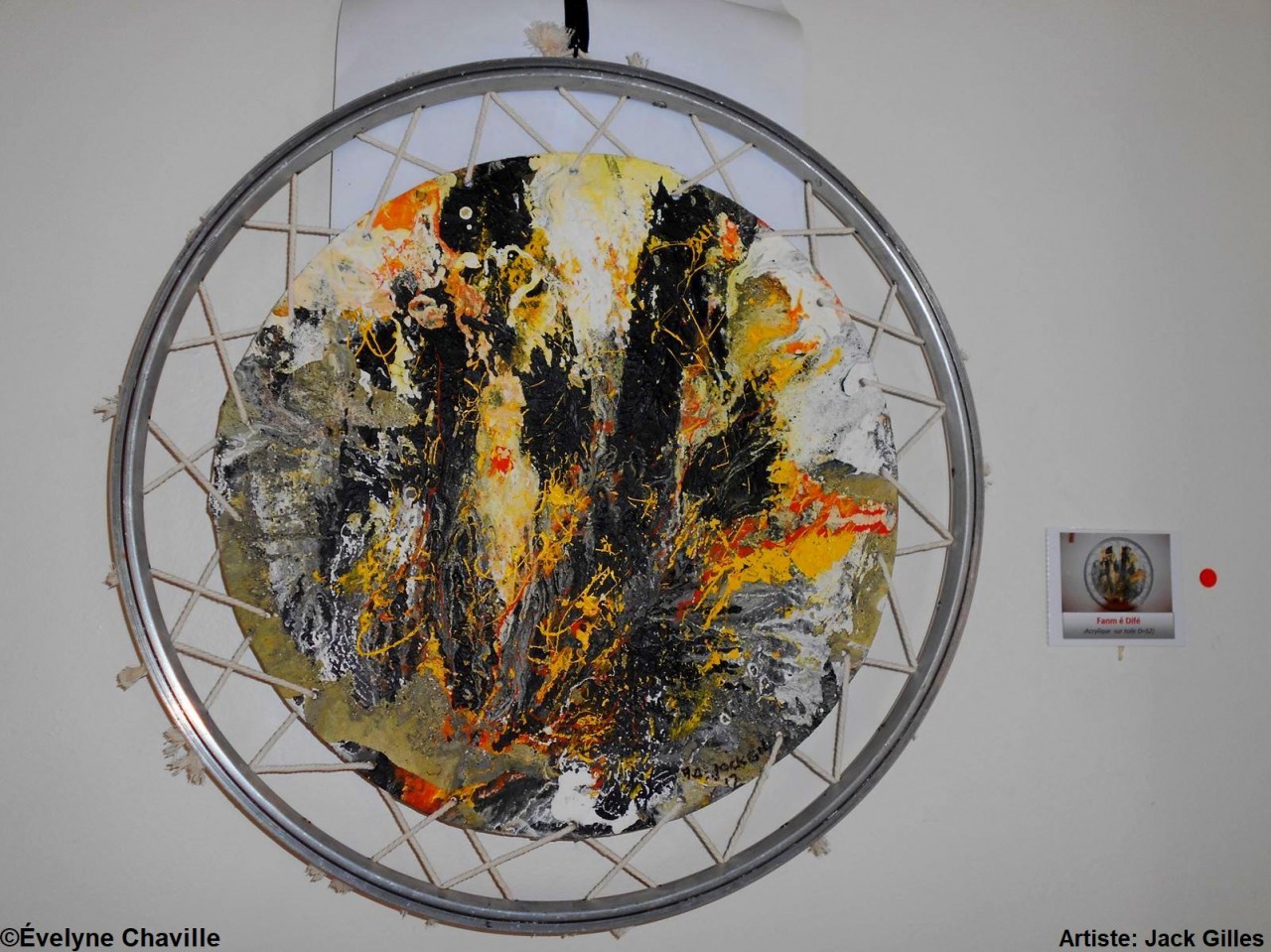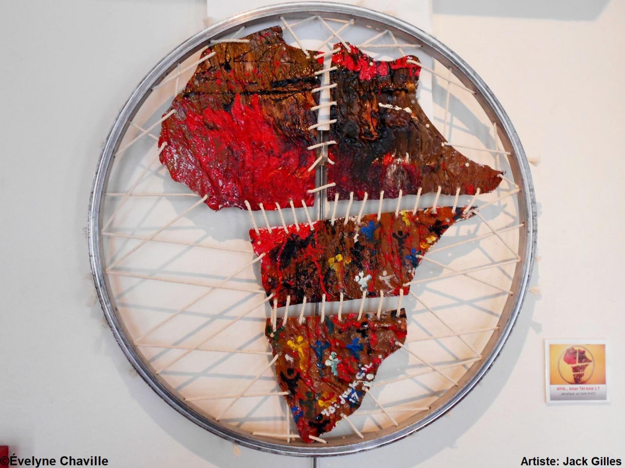Jack Gilles: Il y a aussi du PVC pour les lampes et certaines toiles, des jantes de vélo, de la résine, de la fibre de sisal… Par contre, il n’y a pas de peau de cabri. C’est une technique particulière que j’emploie. Lors de mes séjours en Afrique, mes amis Tchif et Sagna m’ont appris à préparer une toile avant de peindre, c’est un secret que j’ai promis de ne pas dévoiler. Quand je prépare une toile, c’est déjà une oeuvre d’art, il faut que ce soit beau.