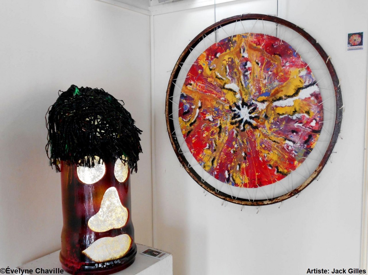 Jack Gilles: Cette exposition compte 72 toiles et 4 totems (lampes) en hommage aux ancêtres. Je suis un artiste plasticien libre, je produis dès que j’en ai envie et cela me fait plaisir. C’est mon épouse qui me dit d’arrêter de peindre pour manger et qui me dit d’arrêter de produire si j’ai un nombre suffisant de toiles pour une exposition. Concernant les expositions, je ne les organise pas à des intervalles précis.