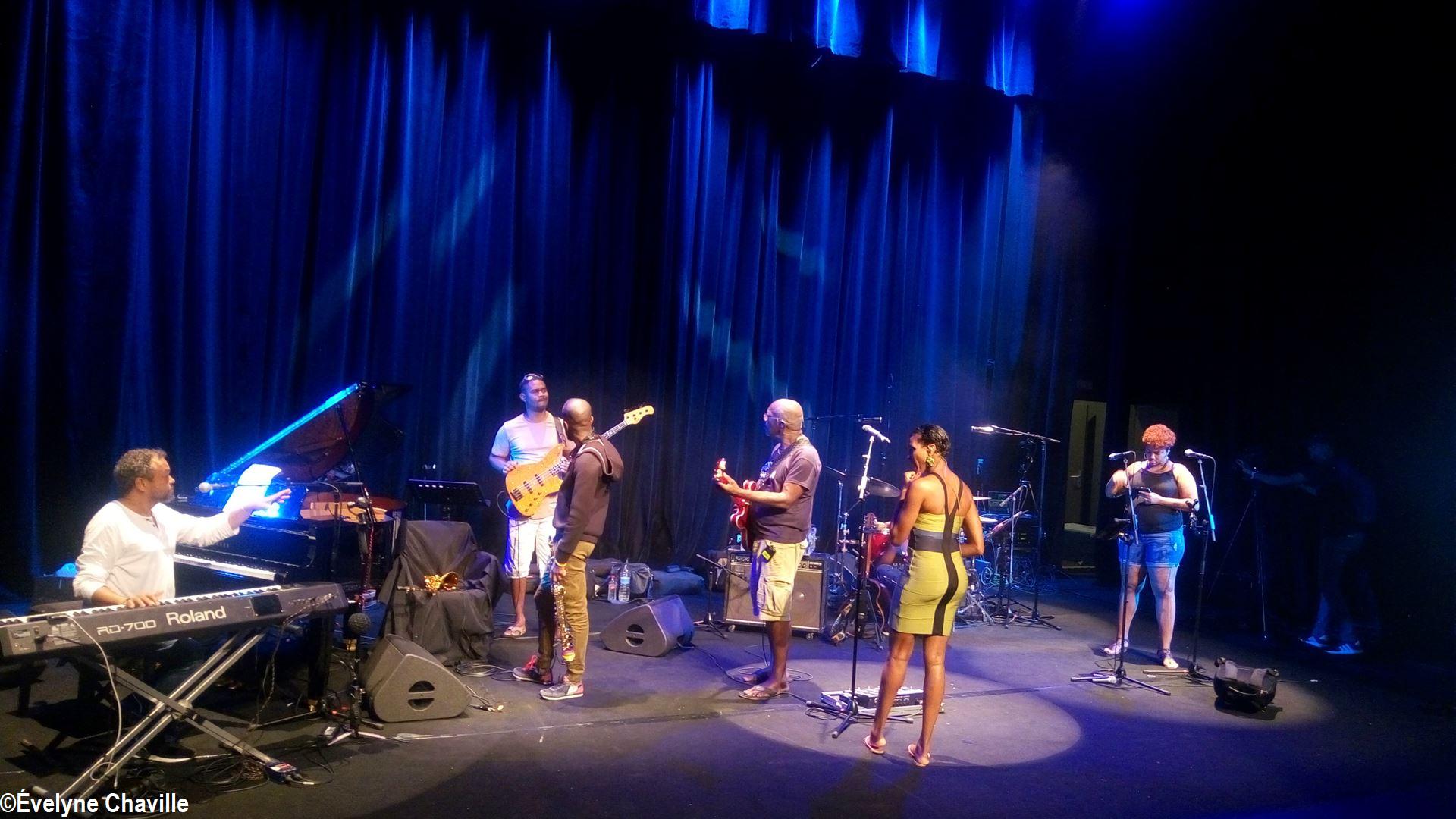 Quelques-unes de ces images auraient peut-être pu illustrer l’interview que le guitariste Jacob Desvarieux devait accorder à Kariculture dans la semaine du 6 janvier 2019. Malheureusement, à cause de ses nombreuses occupations, le leader de Kassav’, n’avait pas pu se libérer… Au cours de cette balance, nous avons pu constater que Jacob Desvarieux, souvent présenté comme un “grand méchant loup” (pour parodier Le Grand Méchant Zouk, spectacle créé par lui) était, en fait, un gars plein d’humour. Il faut dire qu’il était entouré de jeunes et talentueux musiciens – le saxophoniste Jowee Omicil, le bassiste Guy Nsangué et le batteur Yoann Danier – ainsi que du célèbre et sympathique pianiste martiniquais, Mario Canonge.