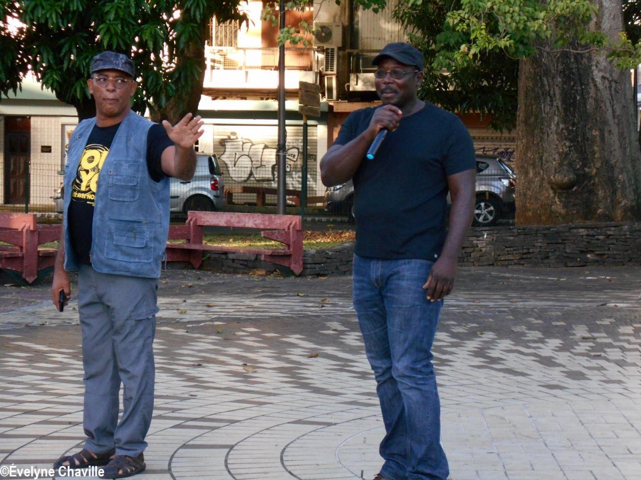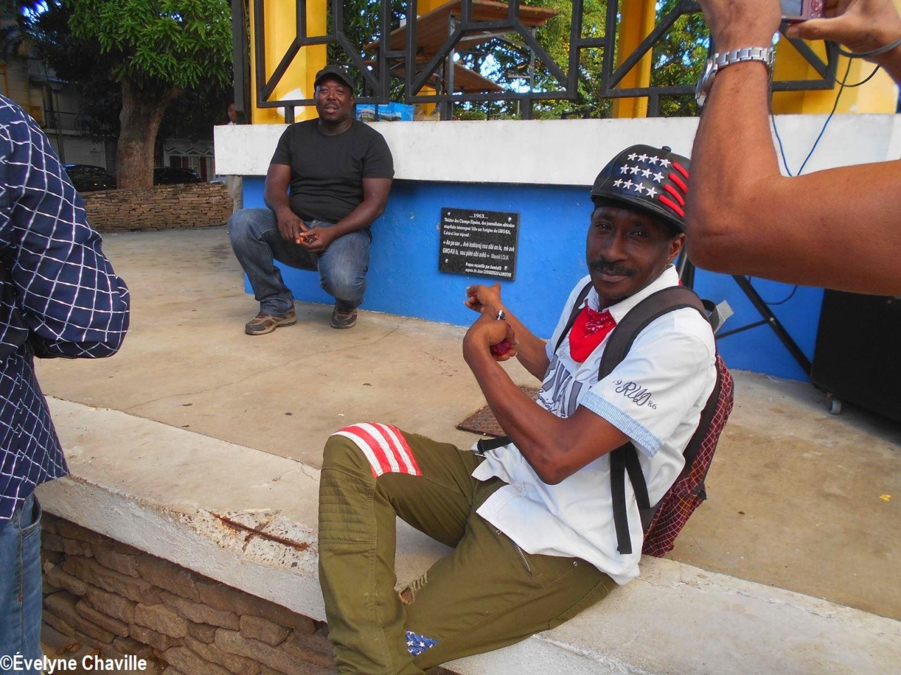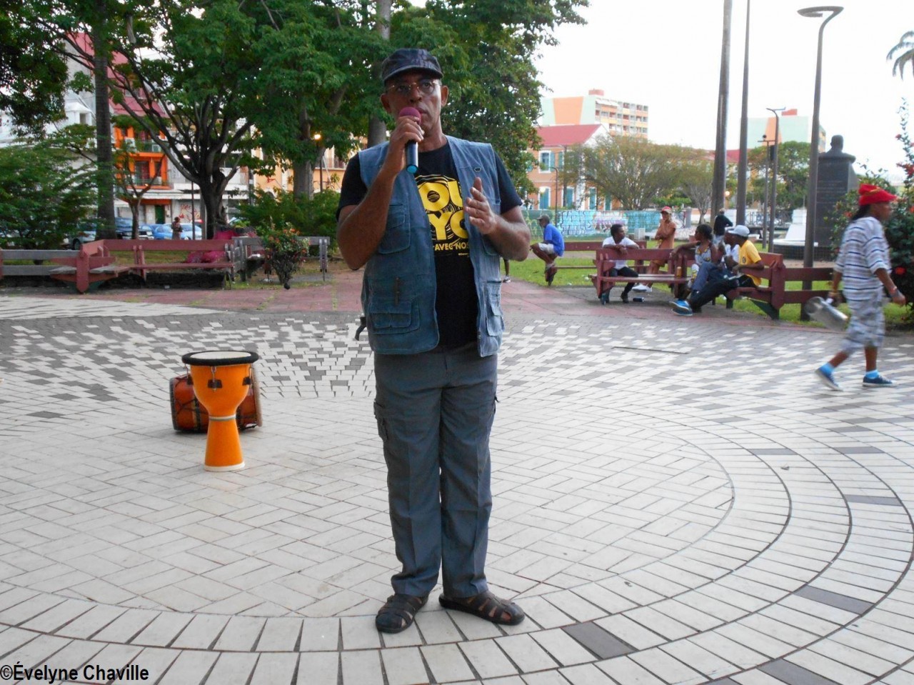 Il s’agit de Christian Mathurin dit “Takadoum”. Ce Guadeloupéen qui vit depuis seize années en Angleterre, a offert à “Vélo” son premier tambour-ka, le Kolèktif Pawòl a Vélo a donc trouvé essentielle sa présence à cette cérémonie et a payé son billet d’avion. “Takadoum” a porté en dansant la gerbe jusqu’à la statue de “Vélo”. Quelques minutes plus tard, cet hommage s’est poursuivi sur la Place de la Victoire, non loin du kiosque. Outre Christian Mathurin qui a parlé, entre autres, du talent et de l’humilité de son ami “Vélo”, étaient présentes plusieurs personnalités qui ont elles aussi connu Marcel Lollia comme le musicien Gilbert Coco, l’animateur, comédien, musicien et membre-fondateur d’Akiyo Ray H, la danseuse de gwoka Nicole Valton ou encore Viviane Dagonia. Cette femme souriante et énergique est la personne qui a organisé en juin 1984 la veillée funèbre de “Vélo” sur cette même place de Pointe-à-Pitre, elle a déclaré qu’elle aimerait que les lieux publics où le gwoka s’exprime soient nombreux afin que la culture s’ouvre au plus grand nombre.