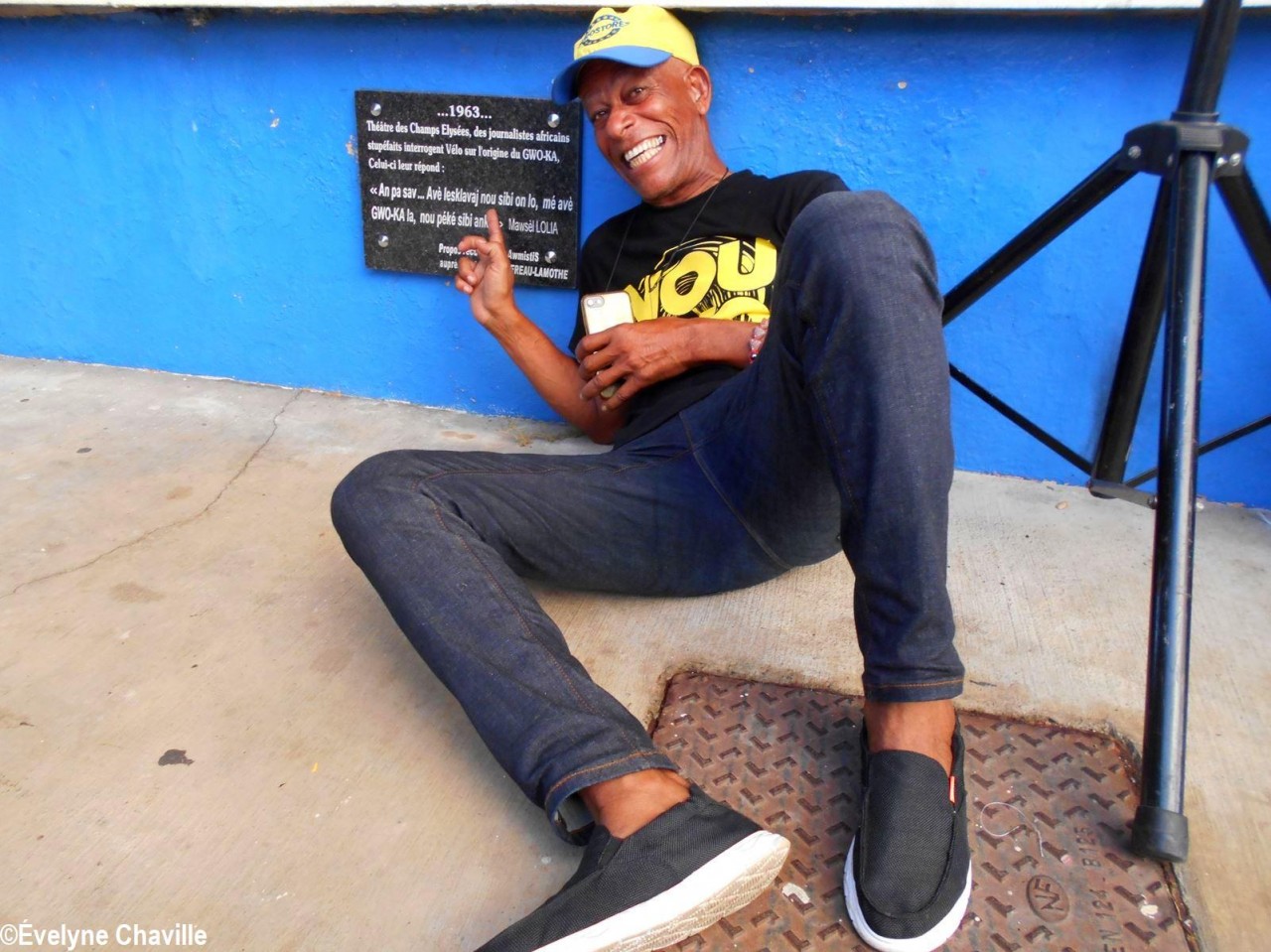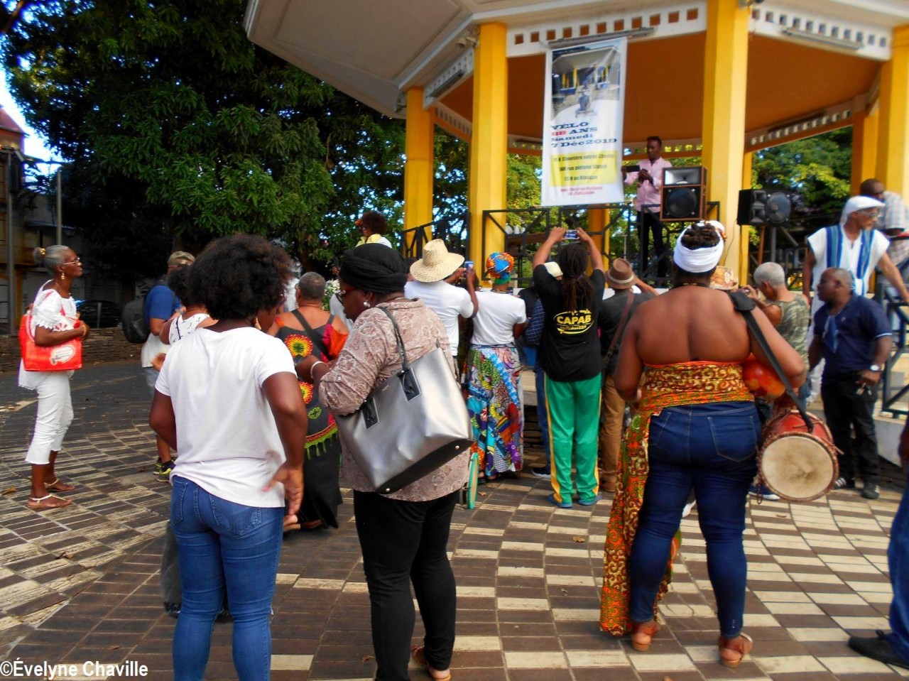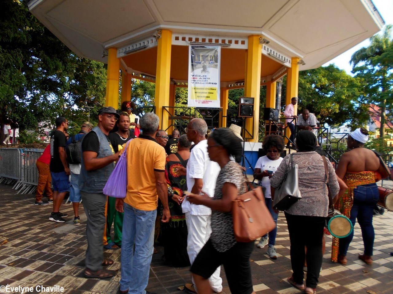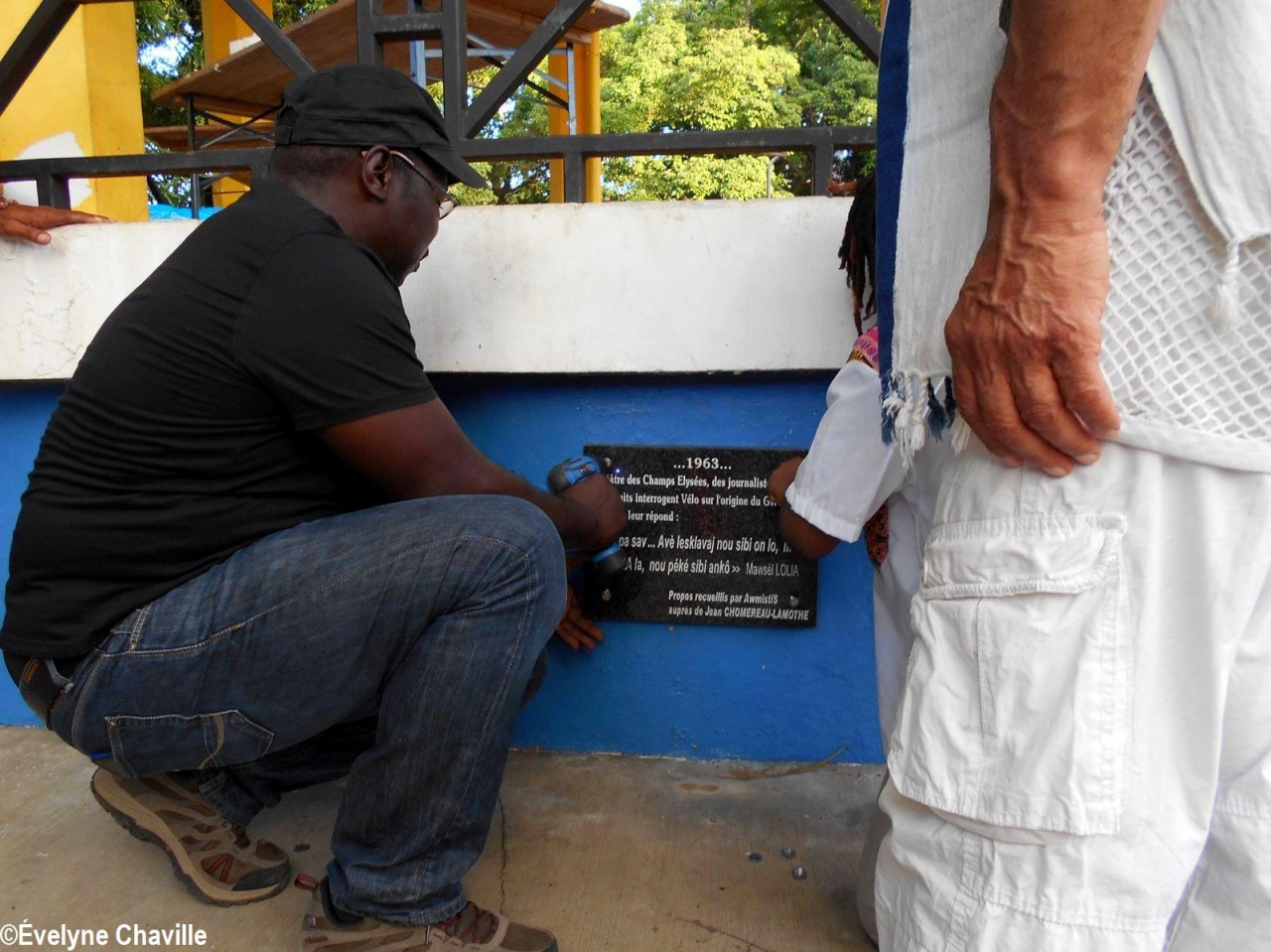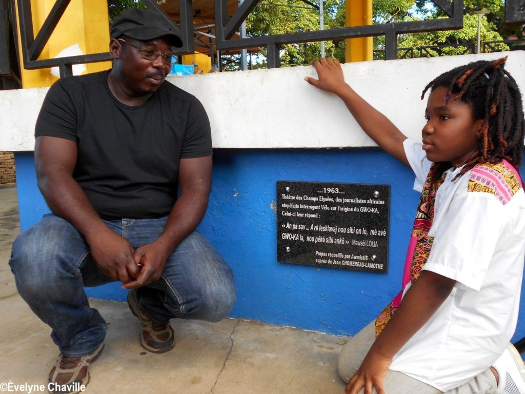 Après ces courtes prises de parole, à 17h15, une plaque a été fixée au kiosque; elle porte le message suivant: “…1963… Théâtre des Champs-Élysées, des journalistes stupéfaits interrogent Vélo sur l’origine du Gwoka, celui-ci leur répond : “An pa sav… Avè lesklavaj nou sibi on lo, mé avè Gwoka-la, nou péké sibi ankò“. Mawsèl Lollia. Propos recueillis par AwmistiS auprès de Jean Chomereau-Lamotte”. La traduction française littérale de cette déclaration en créole: “Je ne sais pas… Avec l’esclavage, nous avons beaucoup subi mais avec le Gwoka, nous ne subirons plus”.