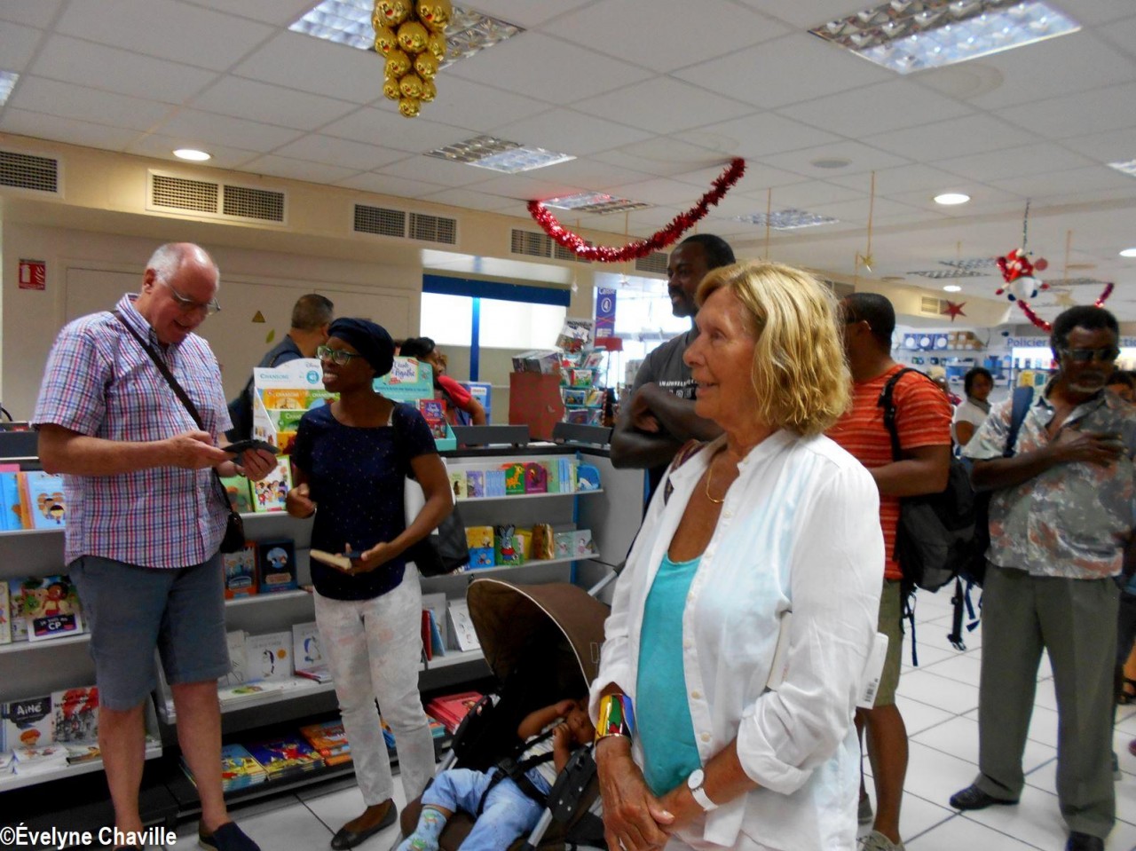Il était 10h08, Maryse Condé, poussée par son époux Richard Philcox, a franchi dans un fauteuil roulant le seuil de la Librairie Générale Jasor située dans la zone industrielle de Jarry dans la commune de Baie-Mahault. À son arrivée, près d’une cinquantaine de personnes a applaudi chaleureusement l’écrivaine guadeloupéenne, auteur de très nombreux ouvrages (romans, essais, livres pour enfants etc), qui se trouvait à Stockholm (Suède) le dimanche 9 décembre dernier afin de recevoir le Prix Nobel Alternatif de Littérature qu’un jury spécial lui avait décerné le 12 octobre dernier. Maryse Condé, assistée de deux amis, dont Molière Athalis, a pris place derrière la table joliment décorée par l’équipe de la Librairie Générale Jasor, en arrière-plan se trouvaient des photographies de la célèbre Guadeloupéenne lors de différentes manifestations. Sans perdre de temps, la séance de dédicace a débuté pour que tout le public présent rencontre durant les deux heures la romancière qui est affaiblie par la maladie et qui aura 82 ans le 11 février prochain. Maryse Condé a tout de suite été envahie par une très grande émotion, une larme a coulé sur sa joue lorsque la première personne de la file d’attente – une lectrice – s’est assise en face d’elle pour la féliciter et se faire dédicacer un roman.