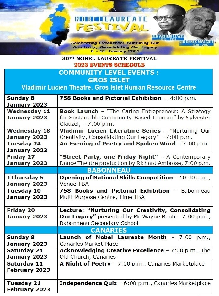 Cette année, le thème du Festival des Prix Nobel qui a lieu du 8 au 31 janvier prochain est “Célébrer l’Excellence: Cultiver notre Créativité, Consolider notre Héritage”. Plusieurs manifestations ont été mises en place par les organisateurs : conférences, soirées littéraires, soirée langue créole, pièces de théâtre, exposition, atelier littéraire, peinture, remise de prix etc. Toutes les activités du Festival qui célèbrent le patrimoine culturel de Sainte-Lucie sont ouvertes au public.
