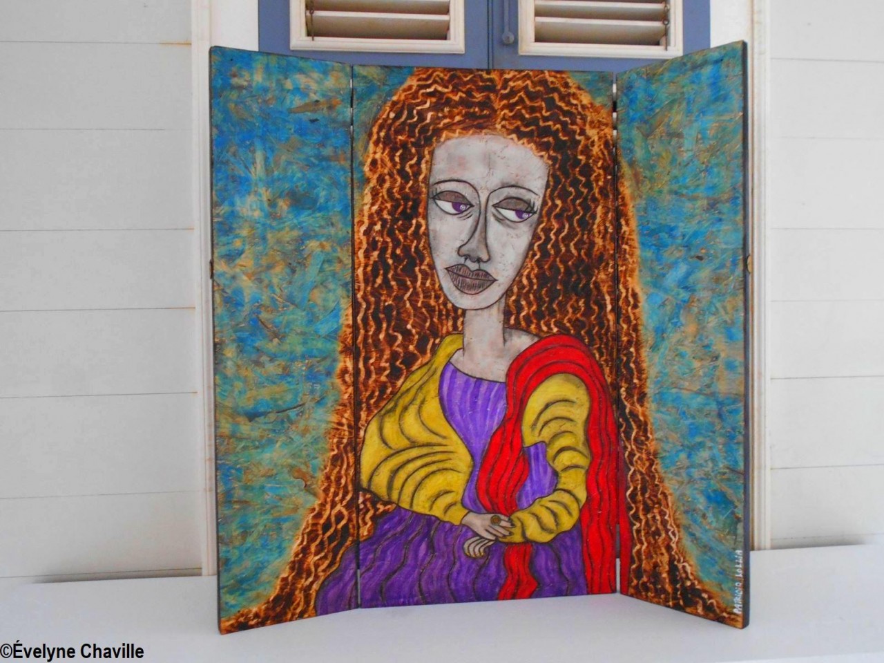 Kariculture : Votre travail est très axé sur le recyclage, vous avez été la première à aller dans les maisons brûlées de Pointe-à-Pitre à la recherche de bois, de planches pour en faire des oeuvres, vous ramassez aussi le bois flotté sur les rivages de Sainte-Anne et du Gosier ou d’ailleurs et maintenant vous vous êtes attaquée aux banderoles publicitaires. Comment cette idée vous est-elle venue?