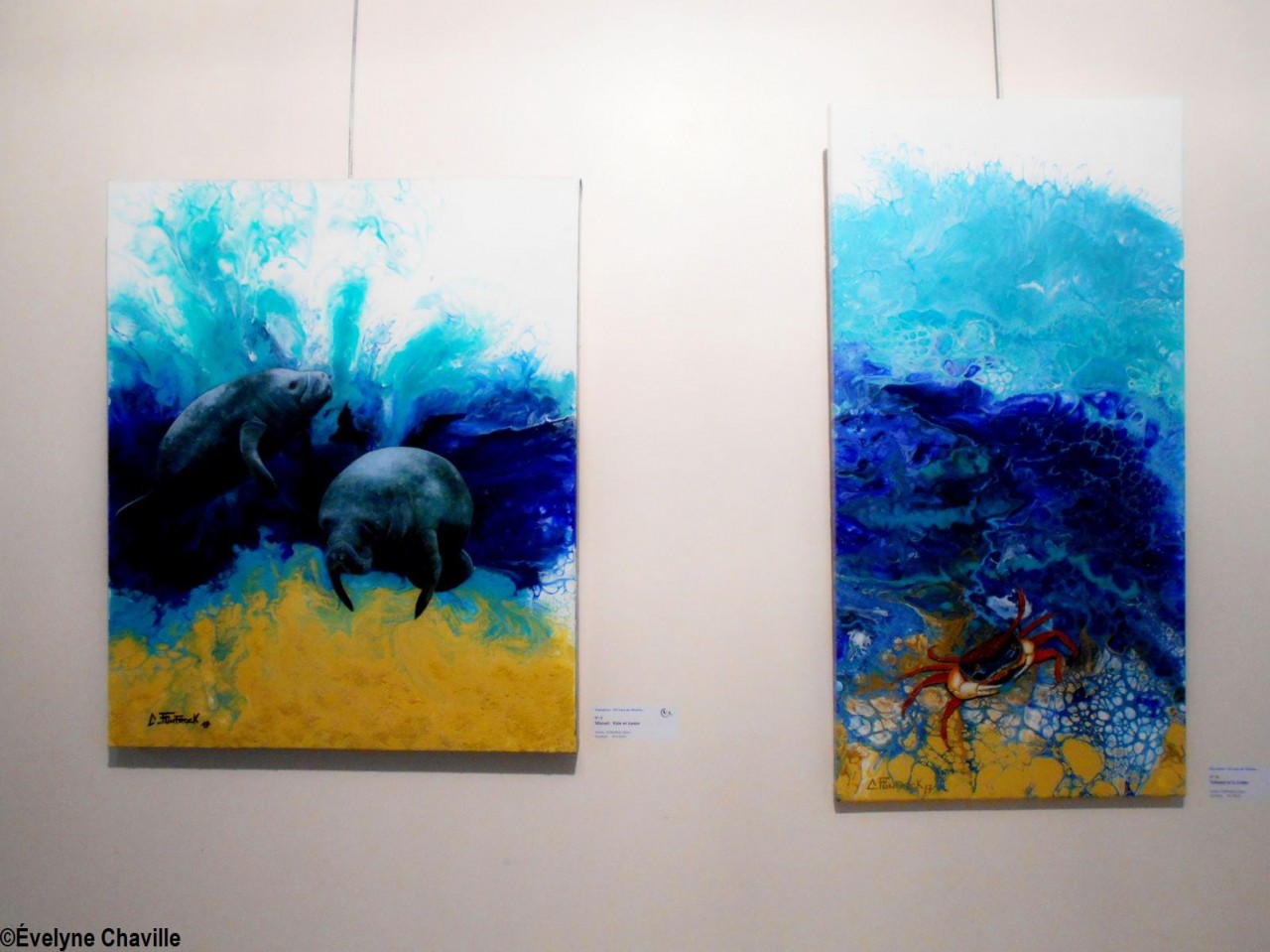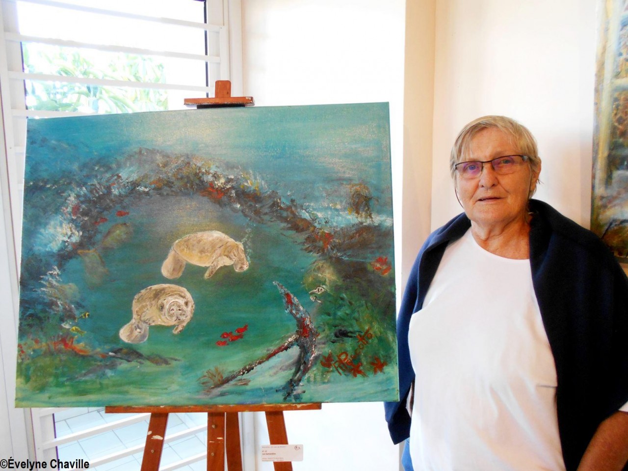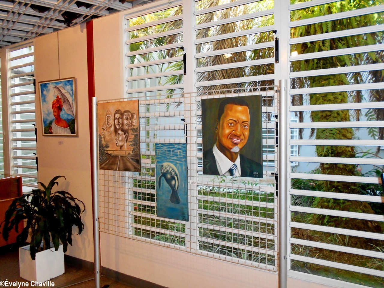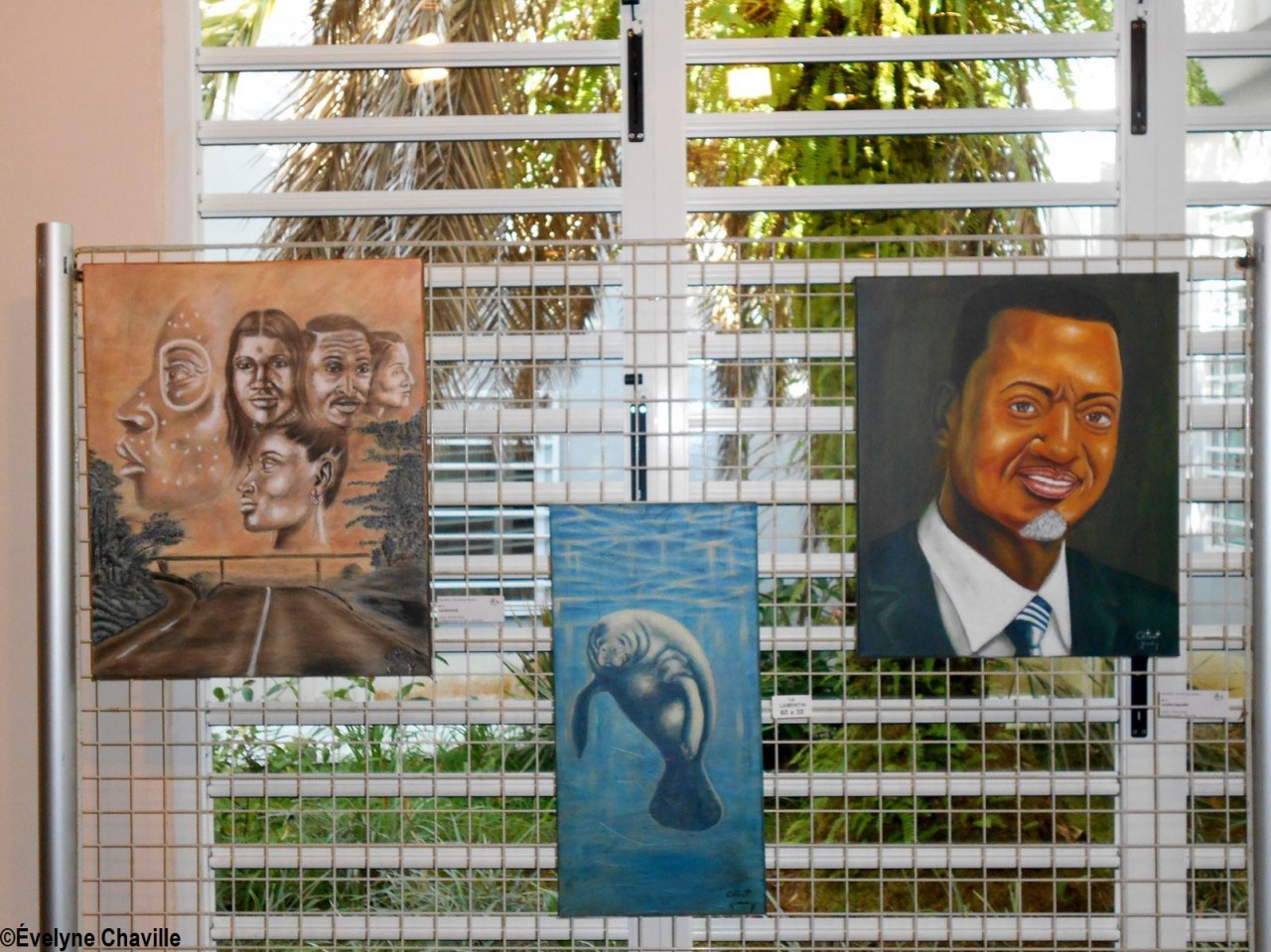 Alors, les visiteurs ont pu admirer des tableaux représentant, entre autres : des lamantins (mammifères qui n’existent plus aujourd’hui dans nos eaux mais qui ont donné leur nom à la commune et que le Parc National de la Guadeloupe tente de réintroduire dans l’île) ; les vestiges de l’usine sucrière Grosse Montagne qui a fermé définitivement ses portes en 1994 après des grèves longues d’ouvriers agricoles ; le Père Chérubin Céleste qui a lutté aux côtés de ces ouvriers de la canne notamment par une grève de la faim en 1975 ; la récolte de la canne à sucre avec ces ouvriers agricoles car, malgré la fermeture de la sucrerie Grosse Montagne, Le Lamentin demeure une terre agricole ; des petites maisons créoles ; la mairie et l’église ; l’actuel maire Jocelyn Sapotille et l’ancien maire José Toribio ; des oeuvres d’art installées sur le territoire car Le Lamentin a été une commune pionnière au niveau artistique en Guadeloupe avec, par exemple, son École d’Arts Plastiques dirigée par le célèbre plasticien, Michel Rovélas, dans les années 1990.