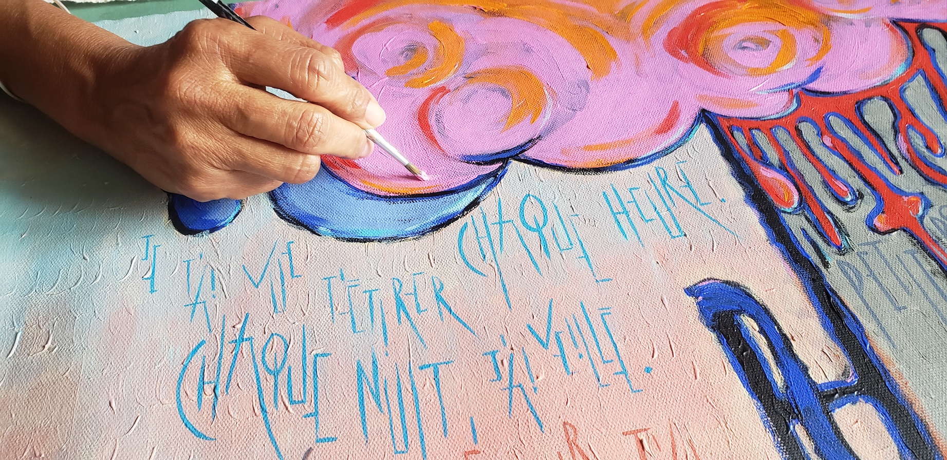On the Atelier Archipels Facebook page, Agnès Djafri says: “In Creole, we often say that a mess makes order. So bigidi is an imbalance. It’s not a fall. It is that compound of resistance, acceptance and resilience that enables us to Be with all the vagaries of life. Bigidi, magnificently conceptualized by choreographer and anthropologist Lénablou, is considered in my colors and my words, as a journey made up of dance steps of an imaginary being who is a little crazy, a little alone,very joyful. This solo exhibition, my first in France, is a beautiful step in my artistic transhumance. Thank you Burgundy, thank you Tonnerre!”