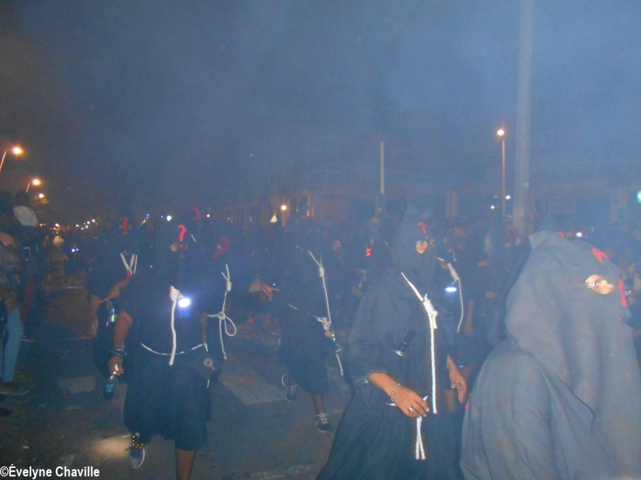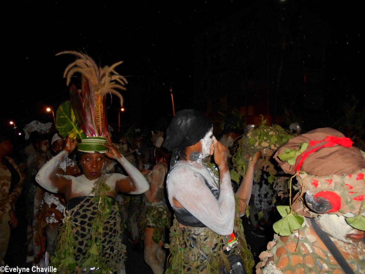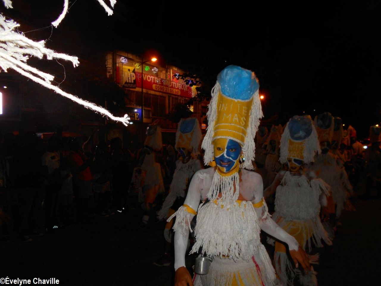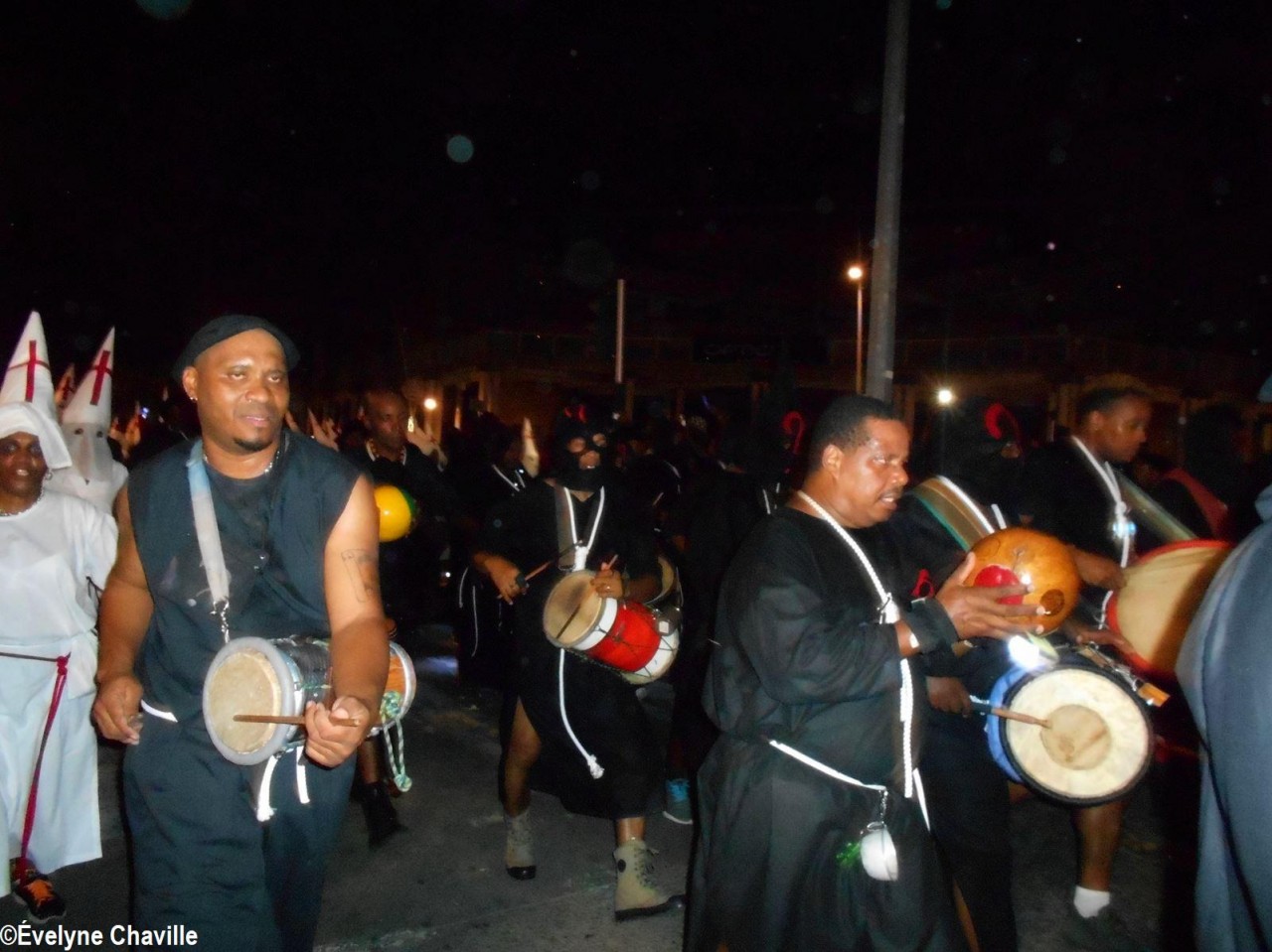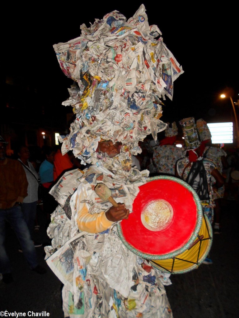 The themes were various but the most striking was that of the Ku Klux Klan, this American secret society founded around 1865 in the the South of the United States to impede the rights of black people which was dissolved in 1877, re-formed in 1915 and banned in 1928 which did not prevent it from continuing its activities… “Nou peké janmé pawdoné yo” (We will never forgive them) sang in Creole the carnaval lovers from the group called Point d’Interrogation, some members represented the hanged ones and were dressed in black with the rope around their neck and others their executioners, were dressed in white… All that took place at a fast pace and with the incense smoke, a compulsory ingredient for the “skin groups” that is intented to keep the evil spirits away, among other things…
