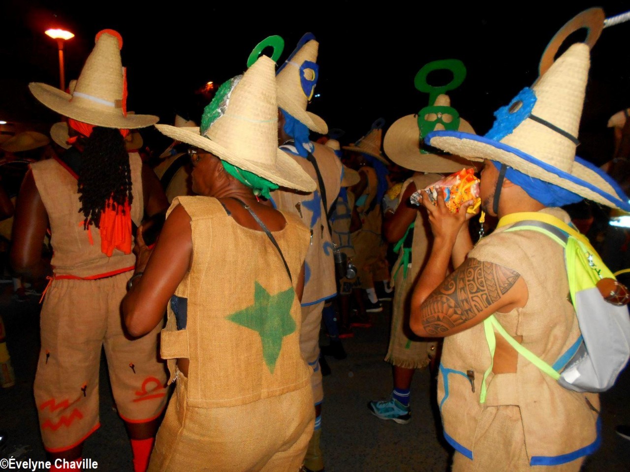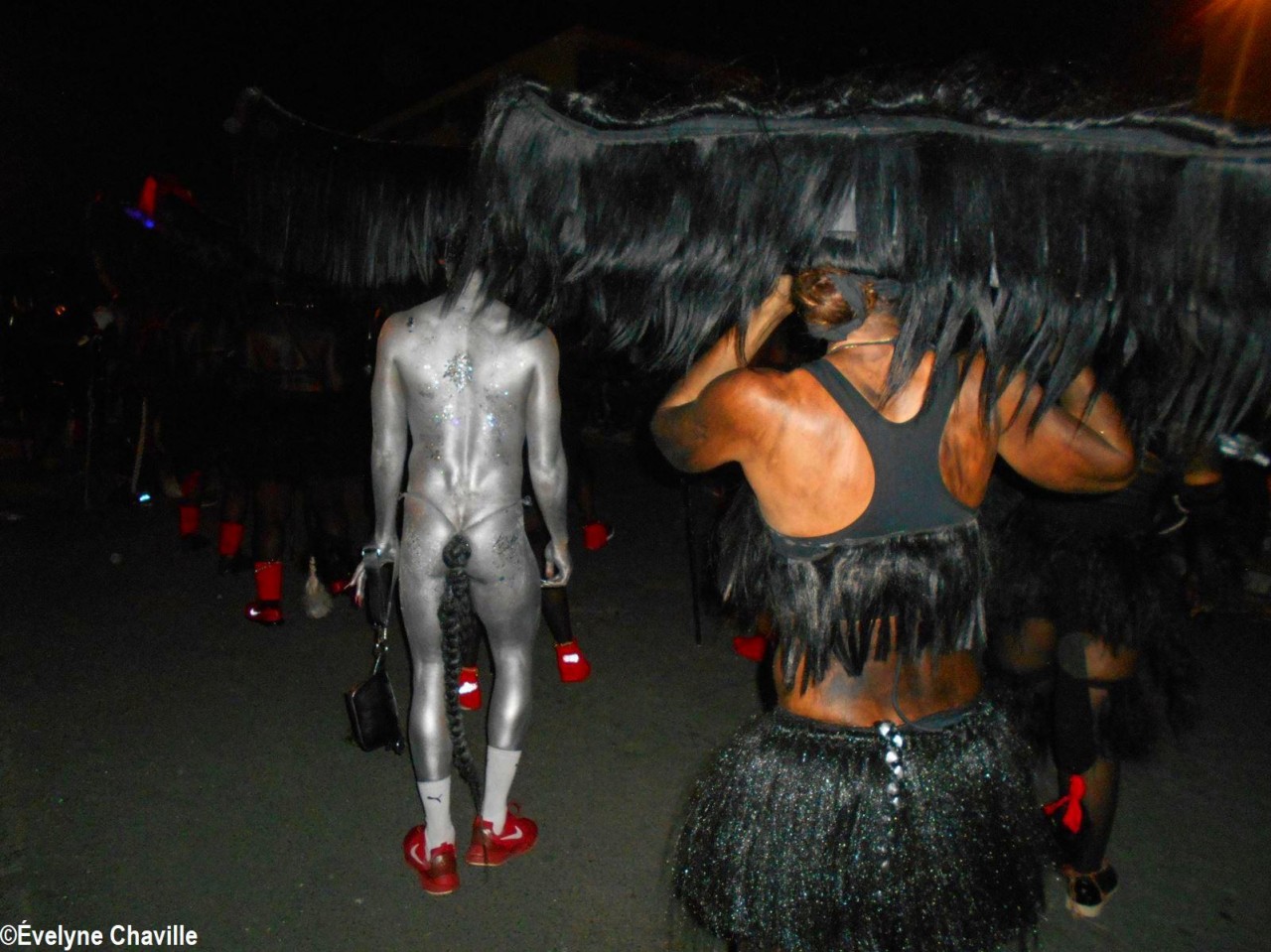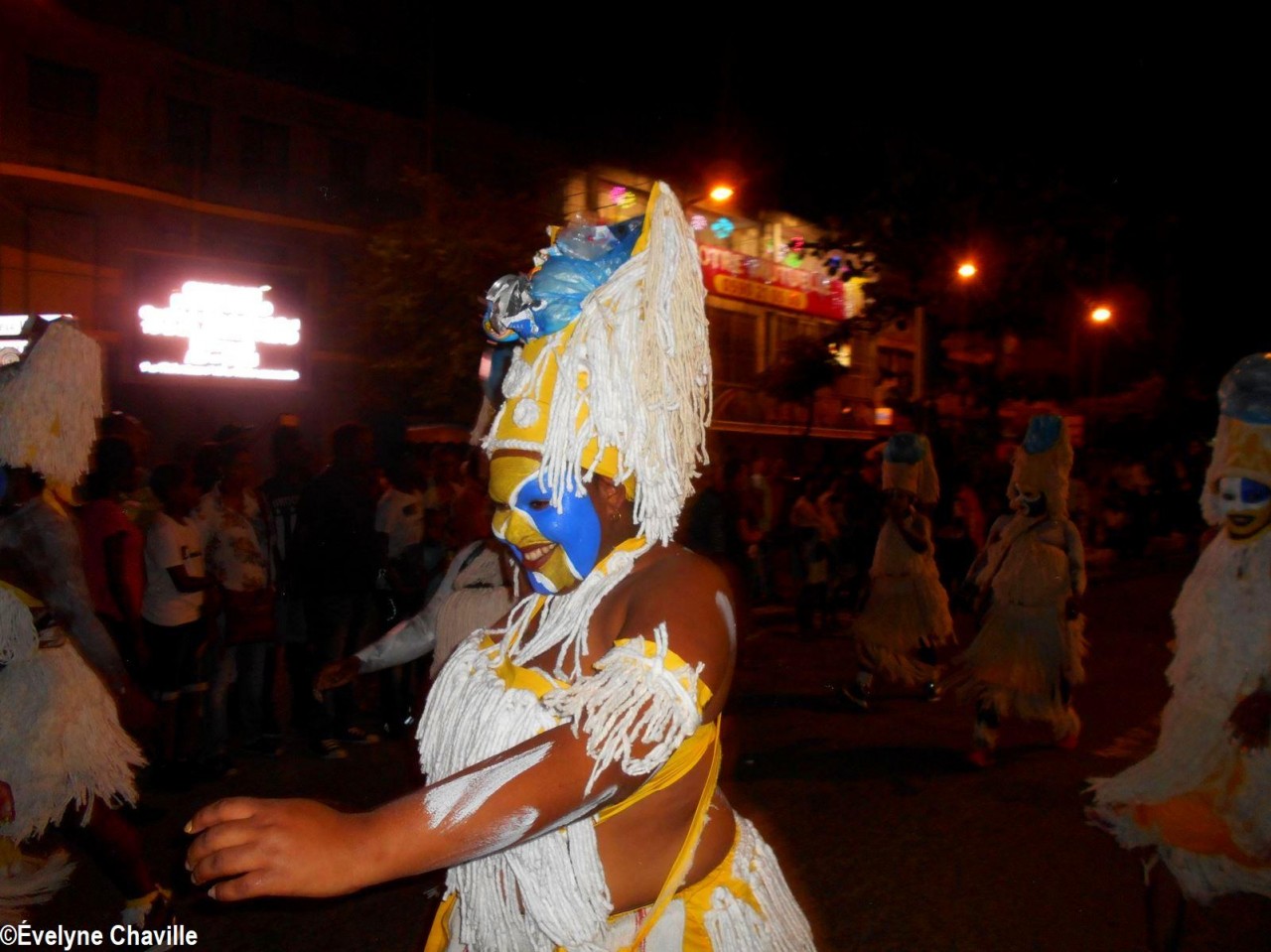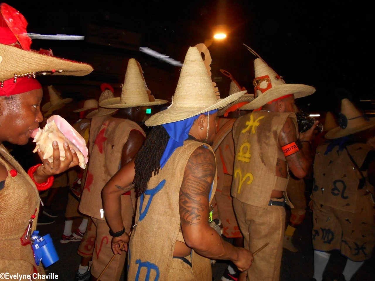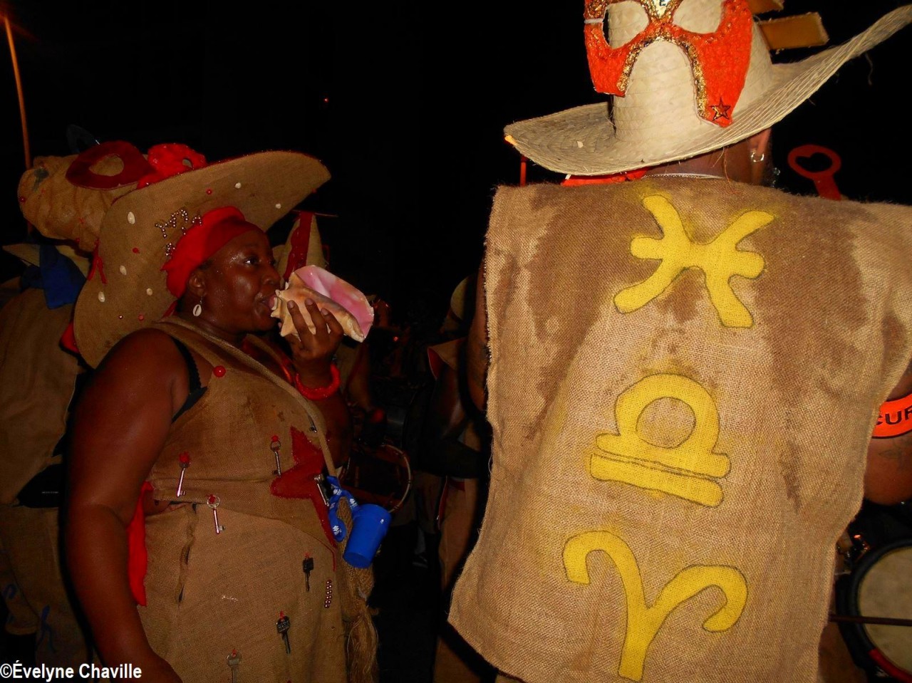 The themes were various but the most striking was that of the Ku Klux Klan, this American secret society founded around 1865 in the the South of the United States to impede the rights of black people which was dissolved in 1877, re-formed in 1915 and banned in 1928 which did not prevent it from continuing its activities… “Nou peké janmé pawdoné yo” (We will never forgive them) sang in Creole the carnaval lovers from the group called Point d’Interrogation, some members represented the hanged ones and were dressed in black with the rope around their neck and others their executioners, were dressed in white… All that took place at a fast pace and with the incense smoke, a compulsory ingredient for the “skin groups” that is intented to keep the evil spirits away, among other things…