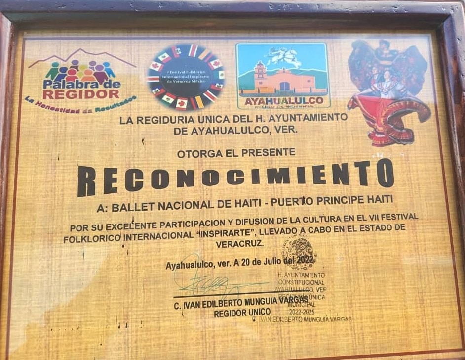 El Ballet folklorique du Théâtre national d’Haïti recibió un diploma de “Reconocimiento” tras su participación en el Festival folklórico internacional InspirArte de Veracruz, México, que tuvo lugar del 18 al 23 de julio en los municipios de Coatepec, Xico, Ayahualulco y Xalapa.