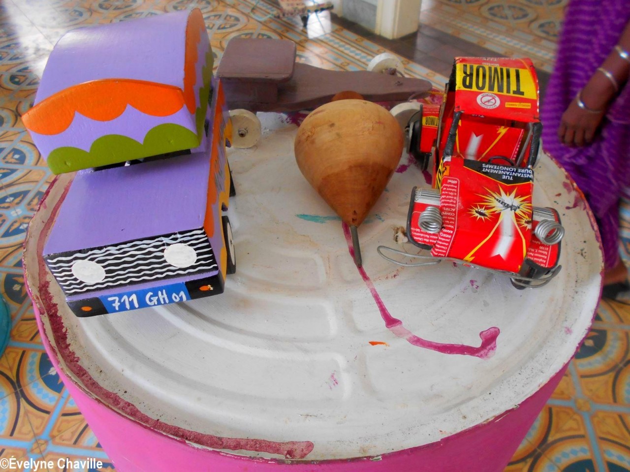 Entonces, los niños aprendieron que era posible divertirse con cosas a menudo muy simples gracias a una buena dosis de imaginación. Durante todo el día, aquellos que están acostumbrados a ir a una tienda para elegir un juguete importado o sentarse frente al televisor y al ordenador o simplemente conectarse con su teléfono móvil para elegir un juego virtual, examinaron cuidadosamente todas estas creaciones, algunas de las cuales se expusieron en barriles en la planta baja del edificio. Escucharon con interés las explicaciones de Maïlys, la representante de “Gwajéka”. Uno de los momentos más importantes de la visita fue cuando los alumnos probaron algunos juegos y juguetes, la directora de una escuela incluso volvió a la infancia frente a la marèl (infernáculo)…