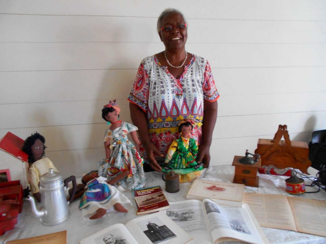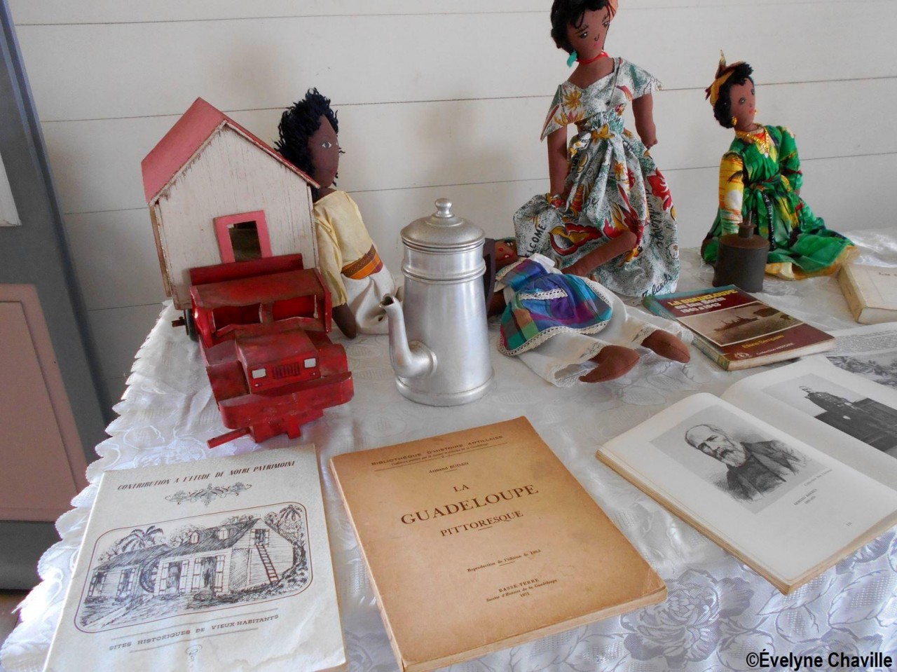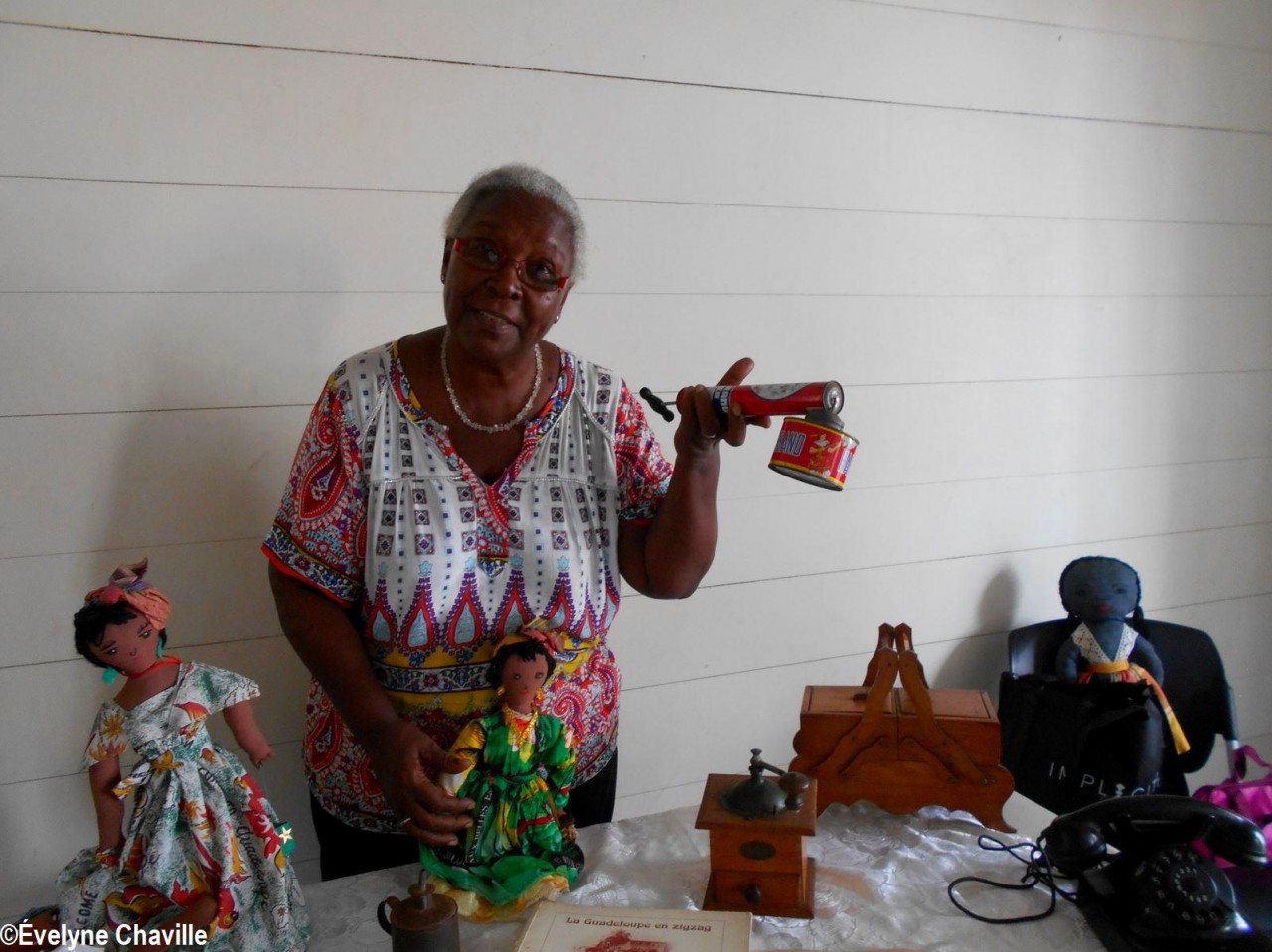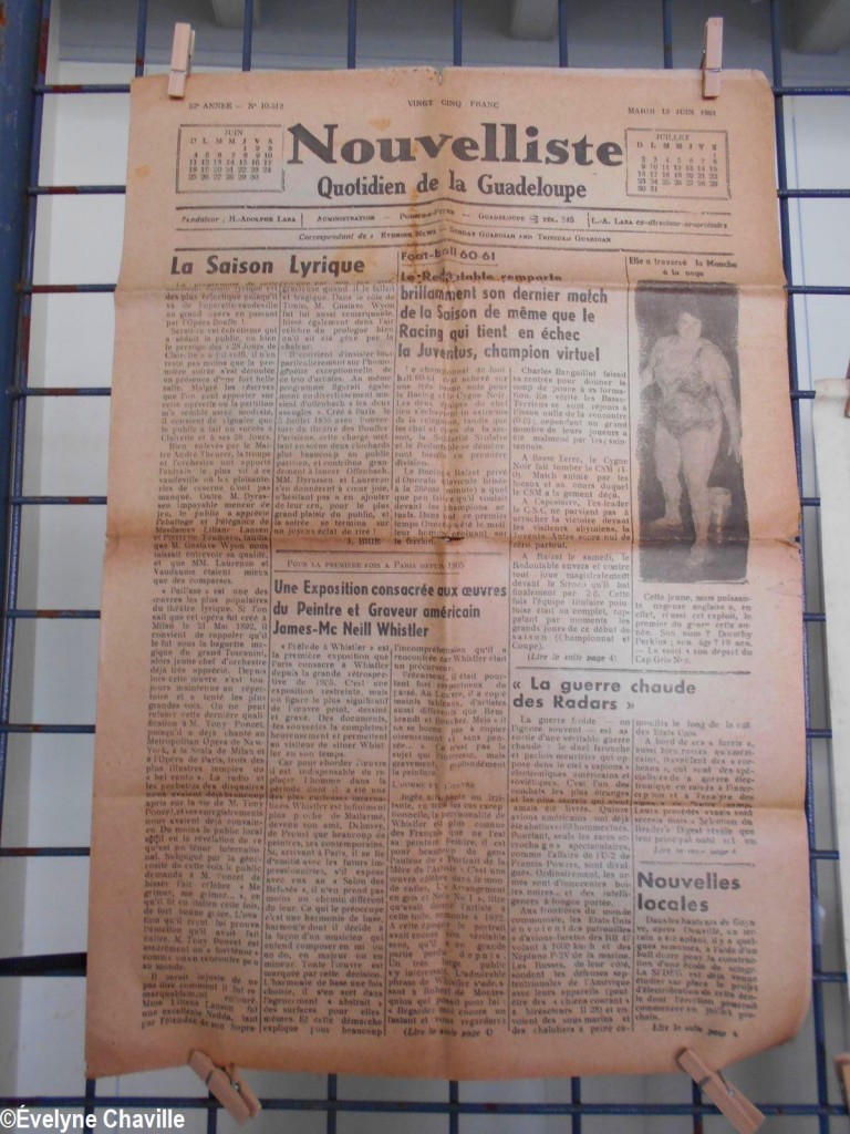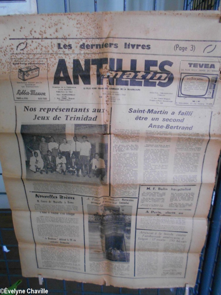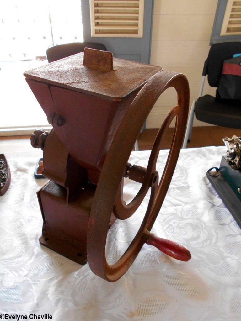 En el primer piso, la sala más grande albergaba máquinas de coser, una balanza de banco para pesar oro y otra balanza para pesar alimentos, velones, una máquina de escribir, un teléfono, un molino para moler las habas de cacao, un tostador, un molinillo de café, una cafetera, algunos “karo” (antepasados de la plancha eléctrica), platos, platillos y tazas de la fábrica de porcelana del padre de Victor Schoelcher (político francés que luchó por la abolición de la esclavitud en 1848), una foto de miembros de la muy conocida asociación “Solidarité Scolaire” con personalidades, muebles antiguos, muñecas de tela, viejos periódicos locales que datan de más de 50 años (Le Nouvelliste, Antilles Matin, La Tribune…) Aunque la mayoría de estos objetos pertenecían a guadalupeños, no se fabricaron en la isla con excepción de los objetos de madera (muebles, etc.). Fue imposible no preguntarle a Marie-Line Bourguignon cómo ella pudo reunir todos estos objetos que son sólo parte de lo que tiene.