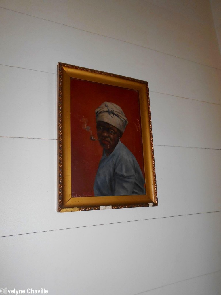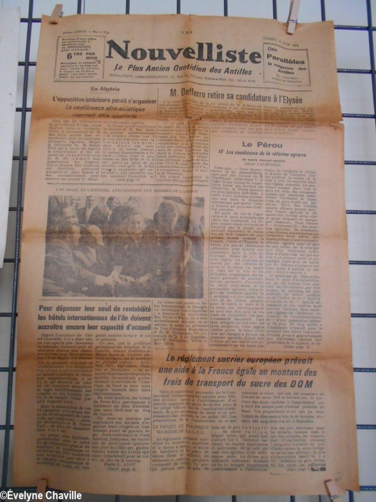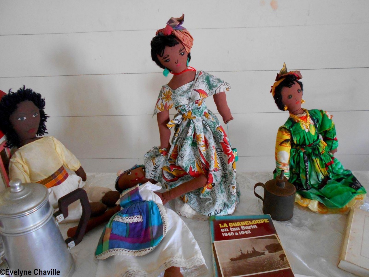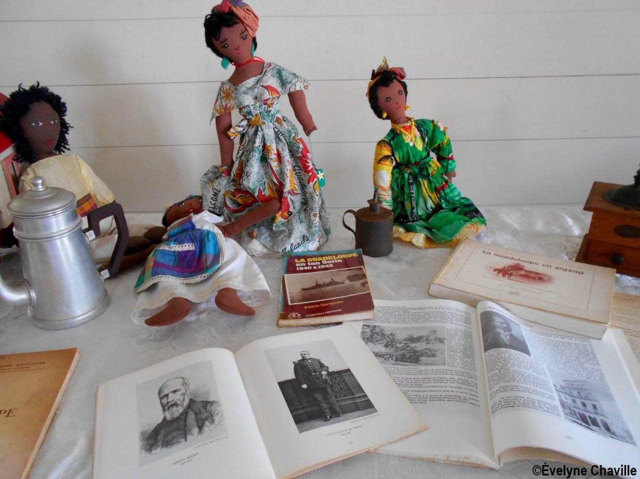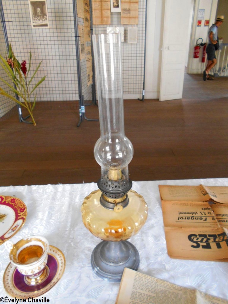 En el primer piso, la sala más grande albergaba máquinas de coser, una balanza de banco para pesar oro y otra balanza para pesar alimentos, velones, una máquina de escribir, un teléfono, un molino para moler las habas de cacao, un tostador, un molinillo de café, una cafetera, algunos “karo” (antepasados de la plancha eléctrica), platos, platillos y tazas de la fábrica de porcelana del padre de Victor Schoelcher (político francés que luchó por la abolición de la esclavitud en 1848), una foto de miembros de la muy conocida asociación “Solidarité Scolaire” con personalidades, muebles antiguos, muñecas de tela, viejos periódicos locales que datan de más de 50 años (Le Nouvelliste, Antilles Matin, La Tribune…) Aunque la mayoría de estos objetos pertenecían a guadalupeños, no se fabricaron en la isla con excepción de los objetos de madera (muebles, etc.). Fue imposible no preguntarle a Marie-Line Bourguignon cómo ella pudo reunir todos estos objetos que son sólo parte de lo que tiene.