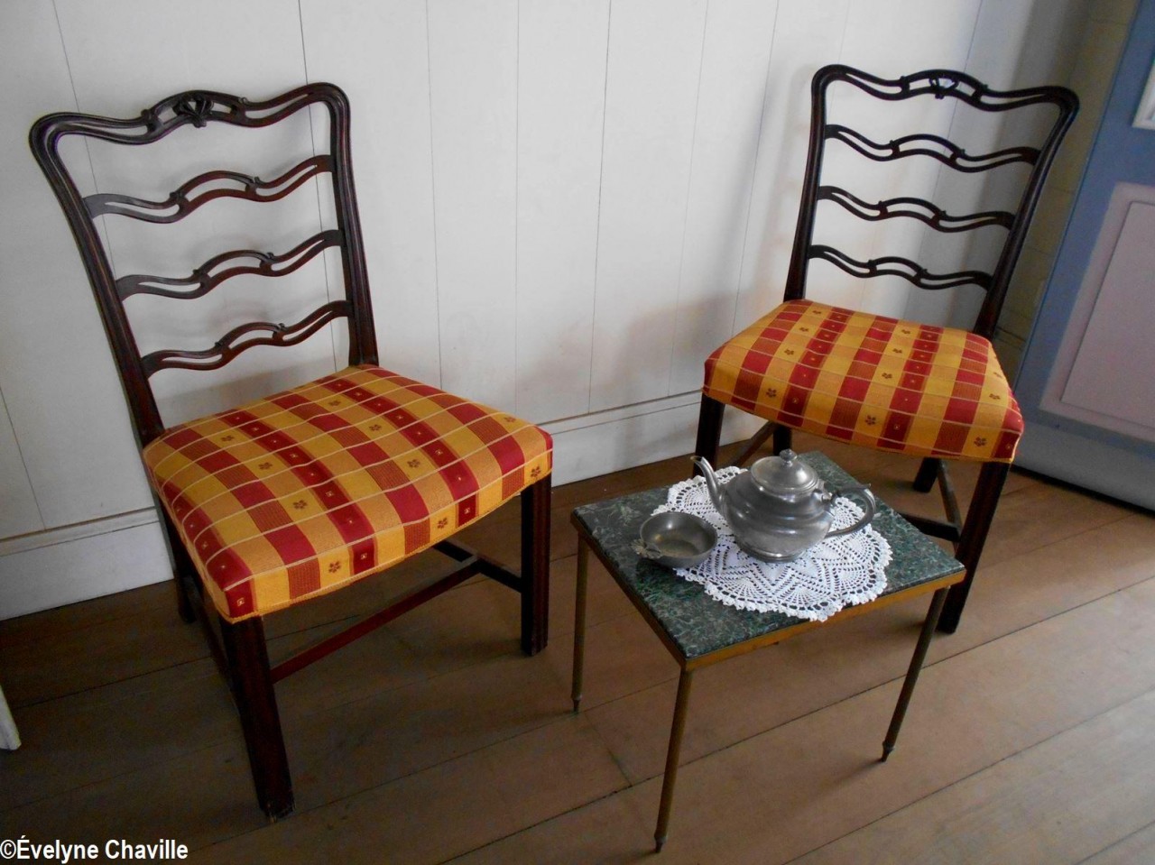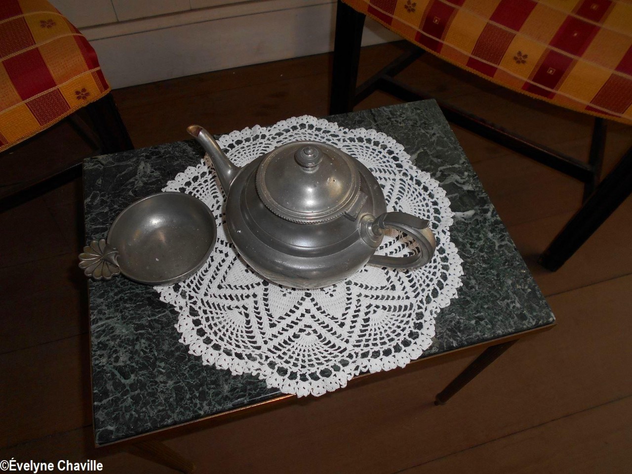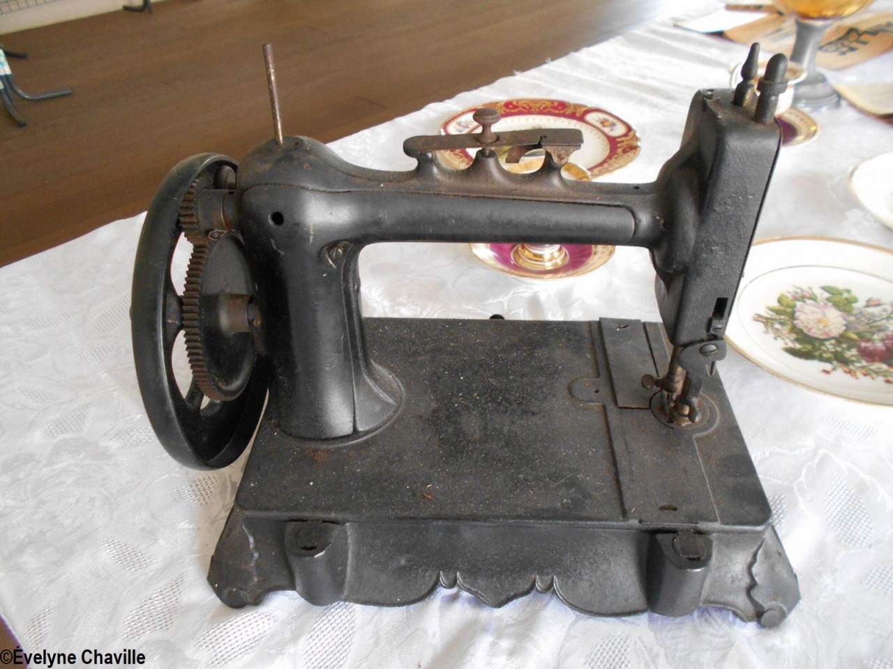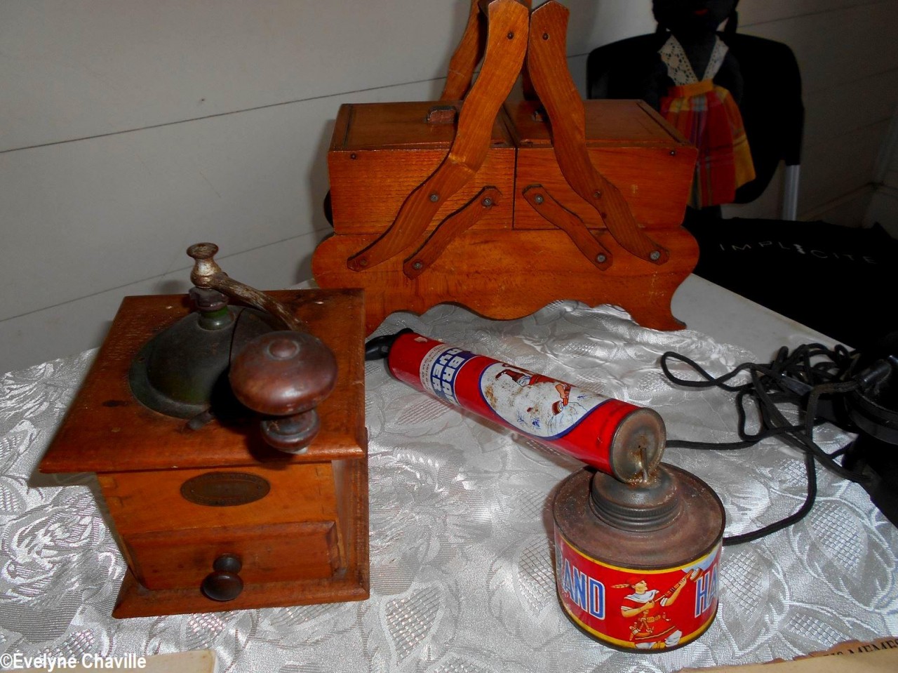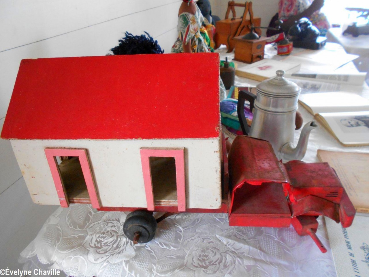 En el primer piso, la sala más grande albergaba máquinas de coser, una balanza de banco para pesar oro y otra balanza para pesar alimentos, velones, una máquina de escribir, un teléfono, un molino para moler las habas de cacao, un tostador, un molinillo de café, una cafetera, algunos “karo” (antepasados de la plancha eléctrica), platos, platillos y tazas de la fábrica de porcelana del padre de Victor Schoelcher (político francés que luchó por la abolición de la esclavitud en 1848), una foto de miembros de la muy conocida asociación “Solidarité Scolaire” con personalidades, muebles antiguos, muñecas de tela, viejos periódicos locales que datan de más de 50 años (Le Nouvelliste, Antilles Matin, La Tribune…) Aunque la mayoría de estos objetos pertenecían a guadalupeños, no se fabricaron en la isla con excepción de los objetos de madera (muebles, etc.). Fue imposible no preguntarle a Marie-Line Bourguignon cómo ella pudo reunir todos estos objetos que son sólo parte de lo que tiene.