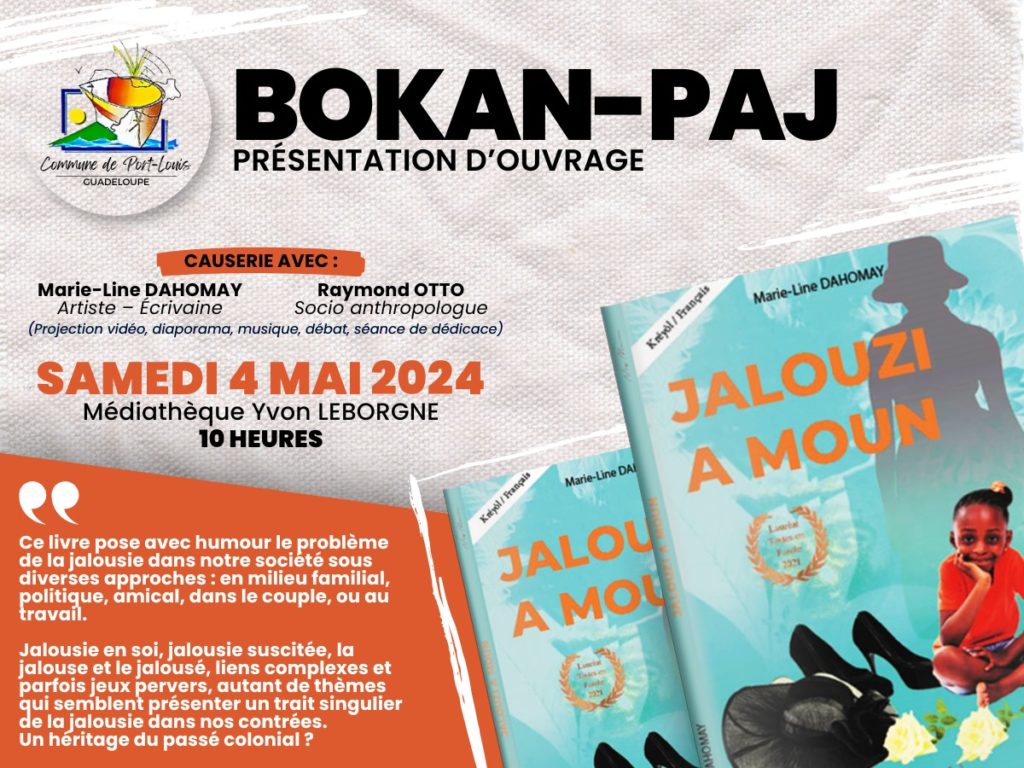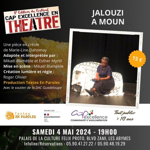 El libro de Marie-Line Dahomay, “Moun A Jalouzi” (3º premio del concurso “Textos en Parole” 2021) fue adaptado al teatro y la obra será interpretada por Mickaël Blamèble y Esther Myrtil, el próximo sábado 4 de mayo a las 19:00 horas en la 8ª edición del Festival Cap Excellence en Théâtre en Les Abymes. La cantante y escritora continúa la promoción de su libro (publicado en Éditions Nèg Mawon) que trata de los celos en Guadalupe a través de charlas. El próximo encuentro con el público tendrá lugar también el sábado 4 de mayo a las 10:00 en la mediateca Yvon Leborgne en Port-Louis.
