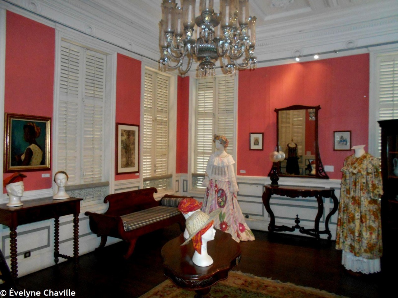 En la planta baja, podrán admirar las dos magníficas lámparas de araña que cuelgan del techo decorado, trajes tradicionales, muebles criollo de caoba, cuadros… Una de estas pintura, firmada A.J. y titulada « Brick dans la Baie de Pointe-à-Pitre », es la última adquisición del museo ; fue comprada en una subasta en abril de 2016 en Drouot (París). Esta obra tiene un valor artístico e histórico excepcional. En efecto, realizada en 1848 (año de la abolición de la esclavitud), es la más antigua de las dos pinturas conocidas que representan la bahía de Pointe-à-Pitre. Esta puesta del sol pintada en un estilo impresionista muestra con una precisión geográfica excelente la cadena montañosa de Basse-Terre, los islotes y las embarcaciones en la rada como un bergantín que era el buque favorito de los traficantes de esclavos y de los corsarios, en aquella época.