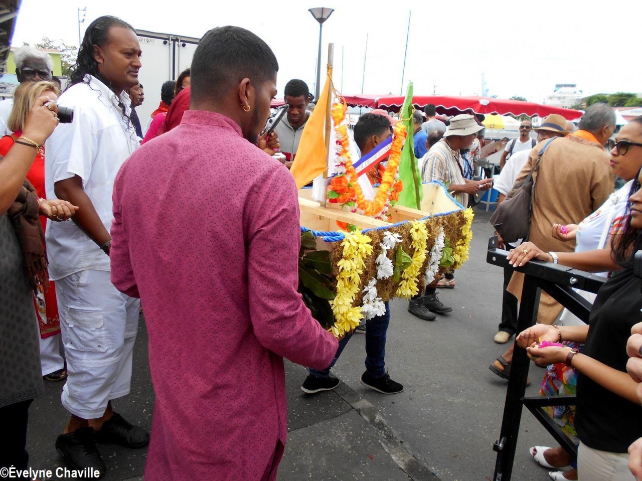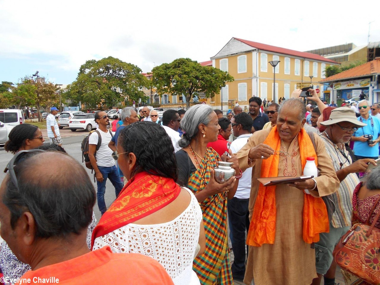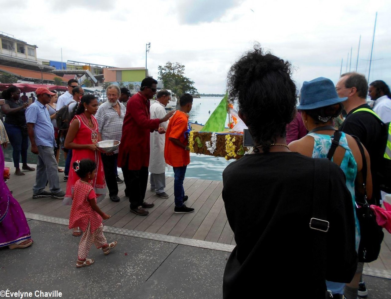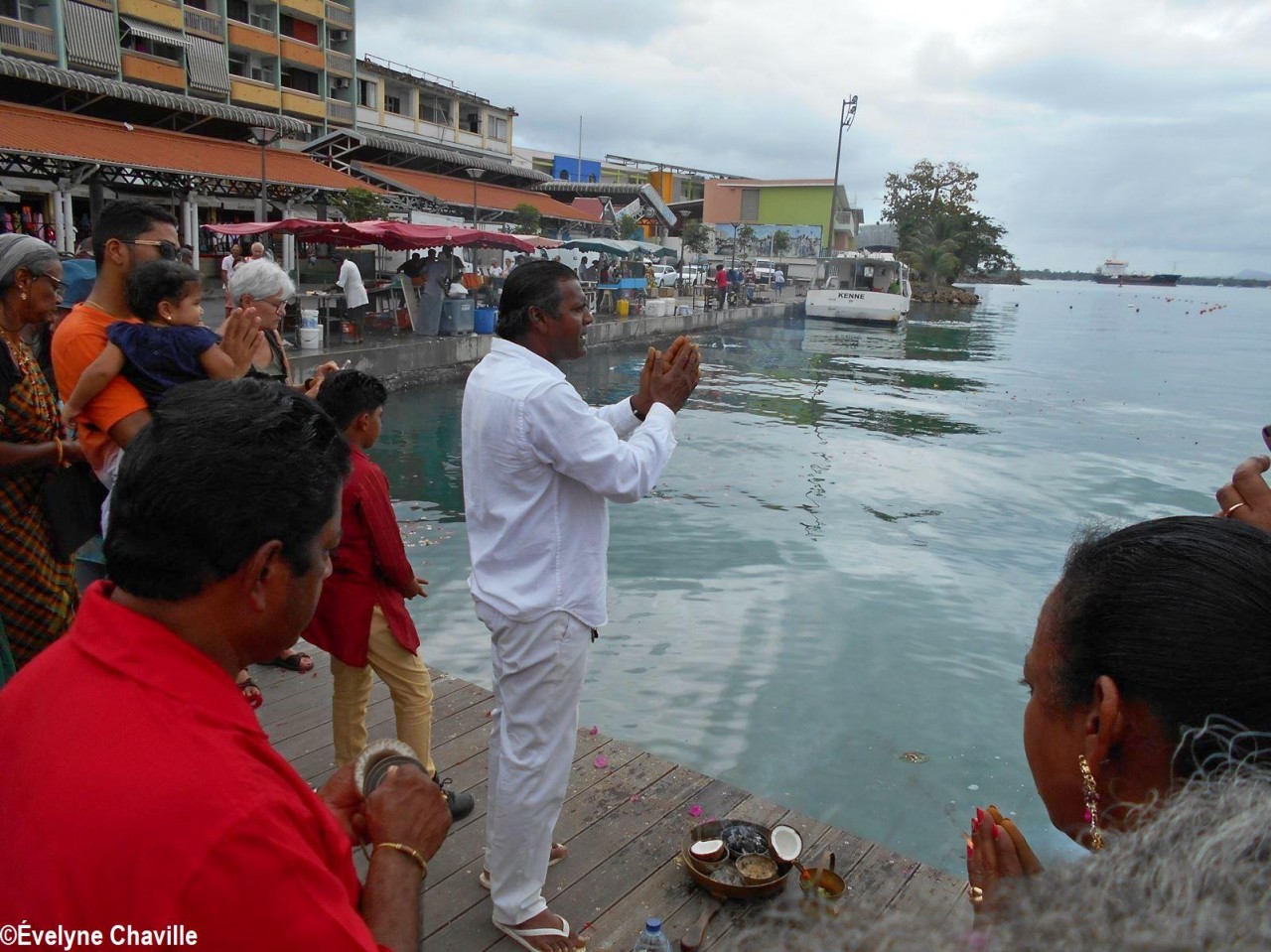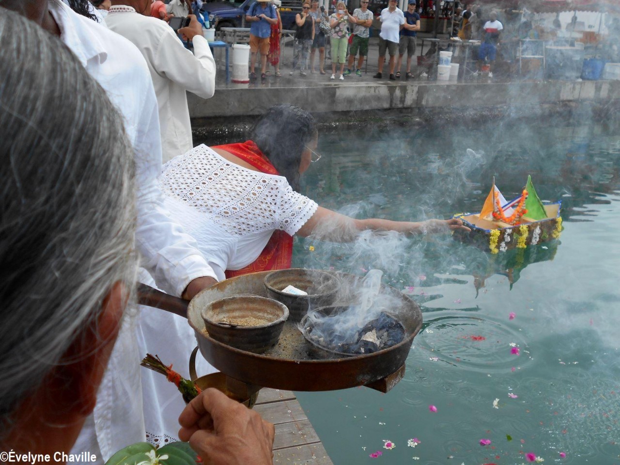 Malgré le temps pluvieux, le public composé de locaux et de touristes a écouté les discours des différents représentants officiels, a assisté à des danses indiennes et a participé aux diverses offrandes (fleurs, riz, lait etc…) à la mer à la mémoire de ces travailleurs indiens. Un petit bateau construit en bois et décoré avec de la mousse et des fleurs symbolisant “L’Aurélie” a été mis à la mer pour marquer le retour.
