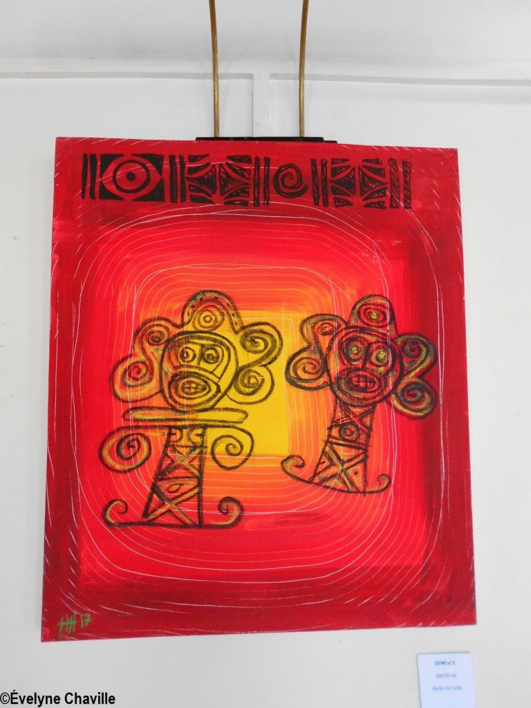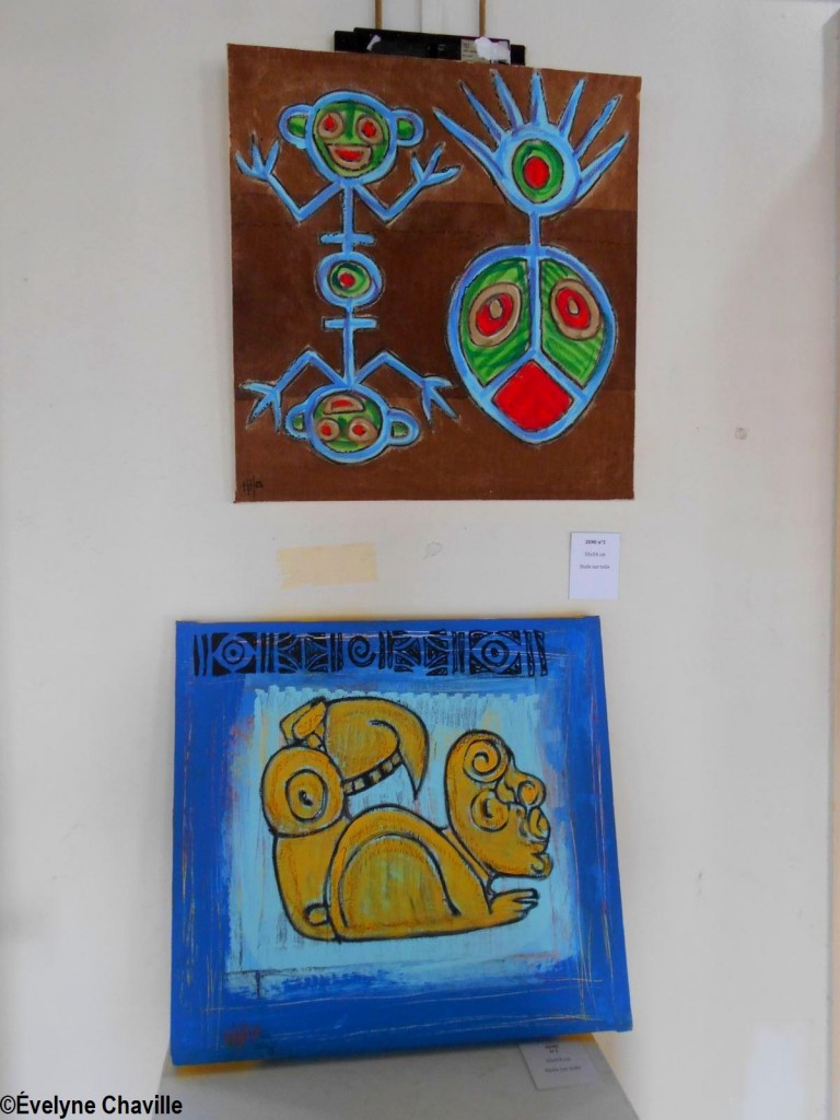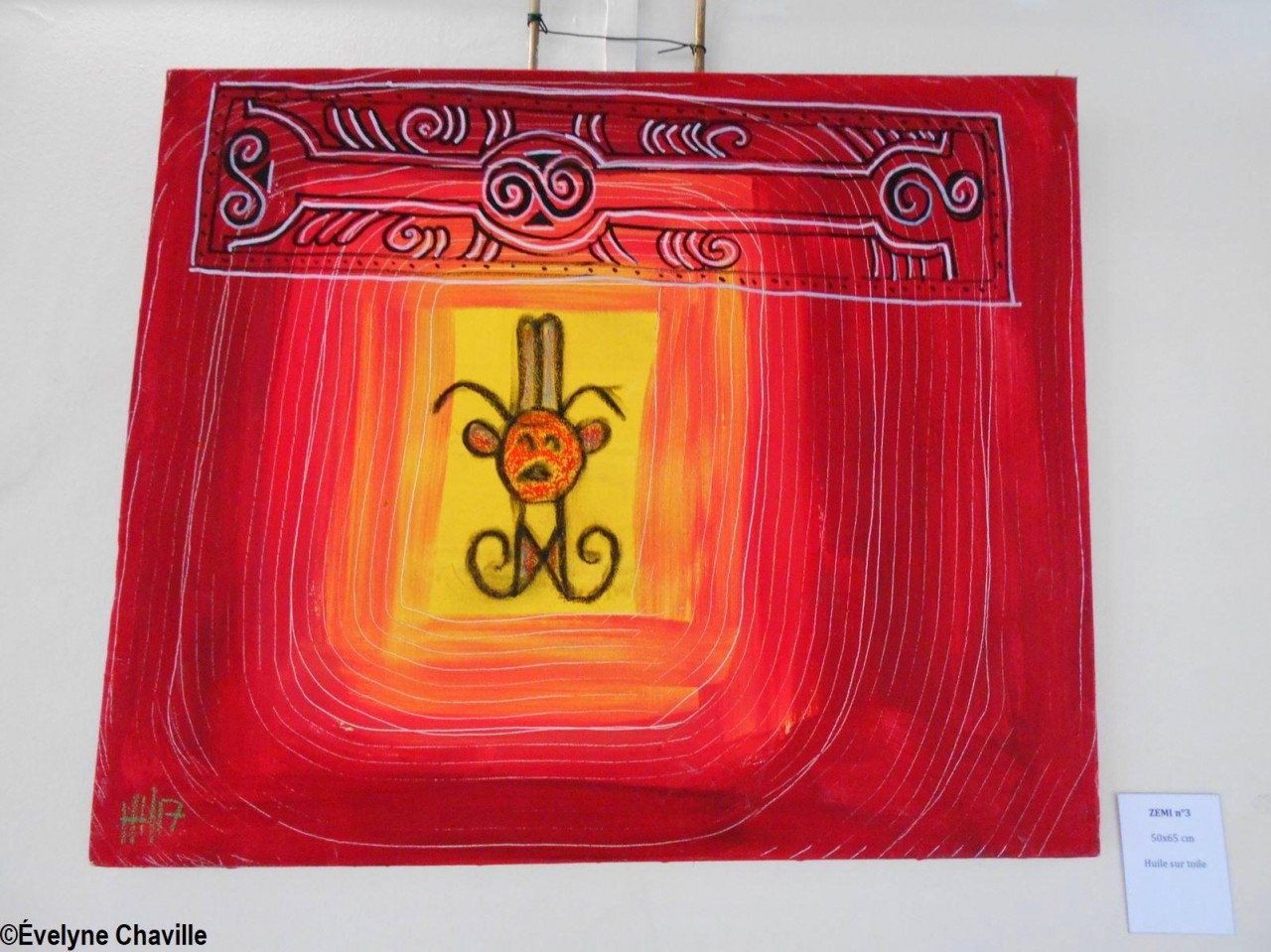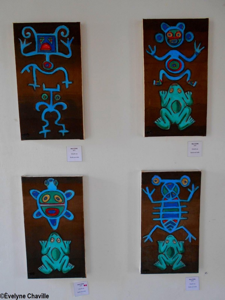Outre les 35 photomontages, l’exposition “Fantômes Caraïbes” se compose également de 35 peintures faites à l’acrylique. Ces motifs sont, en fait, des “Zémis” ou Esprits. “Ils ont été gravés sur des roches aux Petites Antilles (Guadeloupe…) et aux Grandes Antilles (République Dominicaine, Porto Rico…). En les regardant, on voit qu’il y avait un souci de qualité visuelle et plastique, un rythme avec des répétitions et des variations. Je les ai d’abord dessinés puis peints sur la toile”, explique Hugues Henri, le “Zémis n°15” à la main.