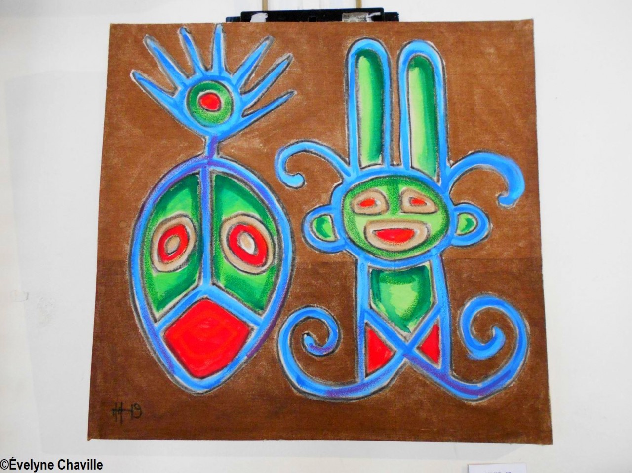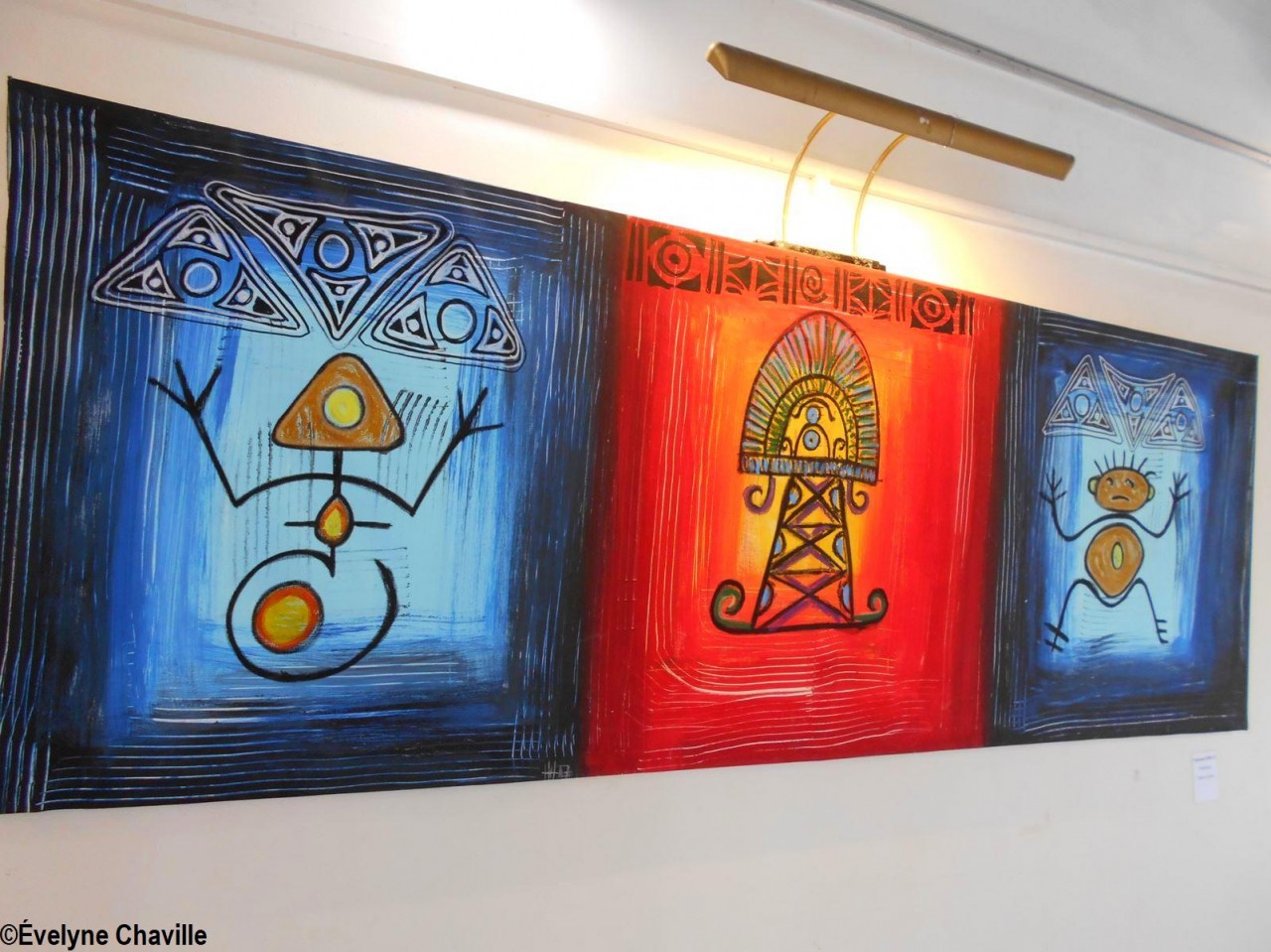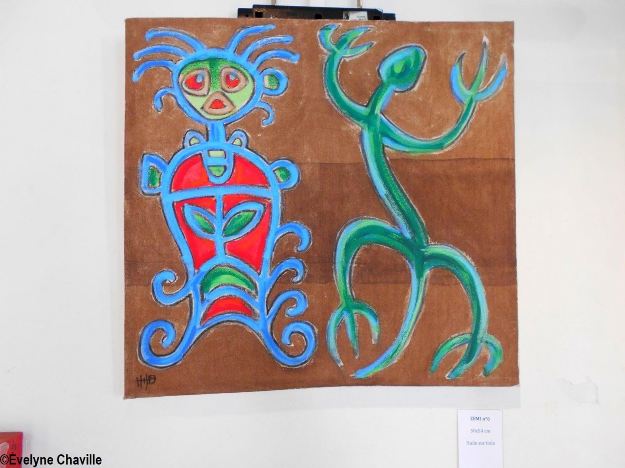 Outre les 35 photomontages, l’exposition “Fantômes Caraïbes” se compose également de 35 peintures faites à l’acrylique. Ces motifs sont, en fait, des “Zémis” ou Esprits. “Ils ont été gravés sur des roches aux Petites Antilles (Guadeloupe…) et aux Grandes Antilles (République Dominicaine, Porto Rico…). En les regardant, on voit qu’il y avait un souci de qualité visuelle et plastique, un rythme avec des répétitions et des variations. Je les ai d’abord dessinés puis peints sur la toile”, explique Hugues Henri, le “Zémis n°15” à la main.