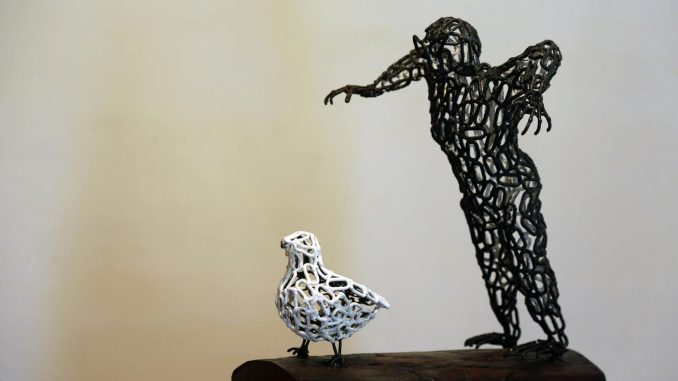 Jacky Poulier est un sculpteur guadeloupéen talentueux et discret qui mérite d’être davantage connu. Certaines de ses oeuvres sont pourtant exposées dans des ronds-points ou sur des places publiques de l’île. Il vient de participer au Pool Art Fair Guadeloupe qui a eu lieu du 17 au 19 juin dernier mais une de ses expositions a marqué tous les esprits, ce fut celle qui s’est déroulée du 20 juin au 4 juillet 2015 à la Salle Rémi Nainsouta de Pointe-à-Pitre. Son nom était “Re…Naissance”, une exposition de sculptures faites à partir de la chaîne en fer.
