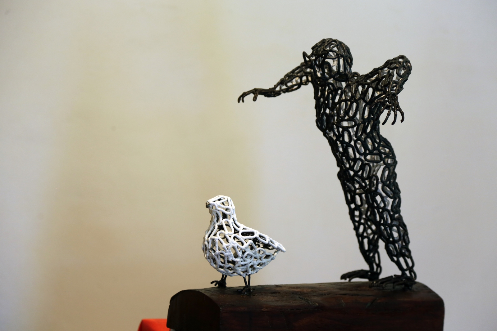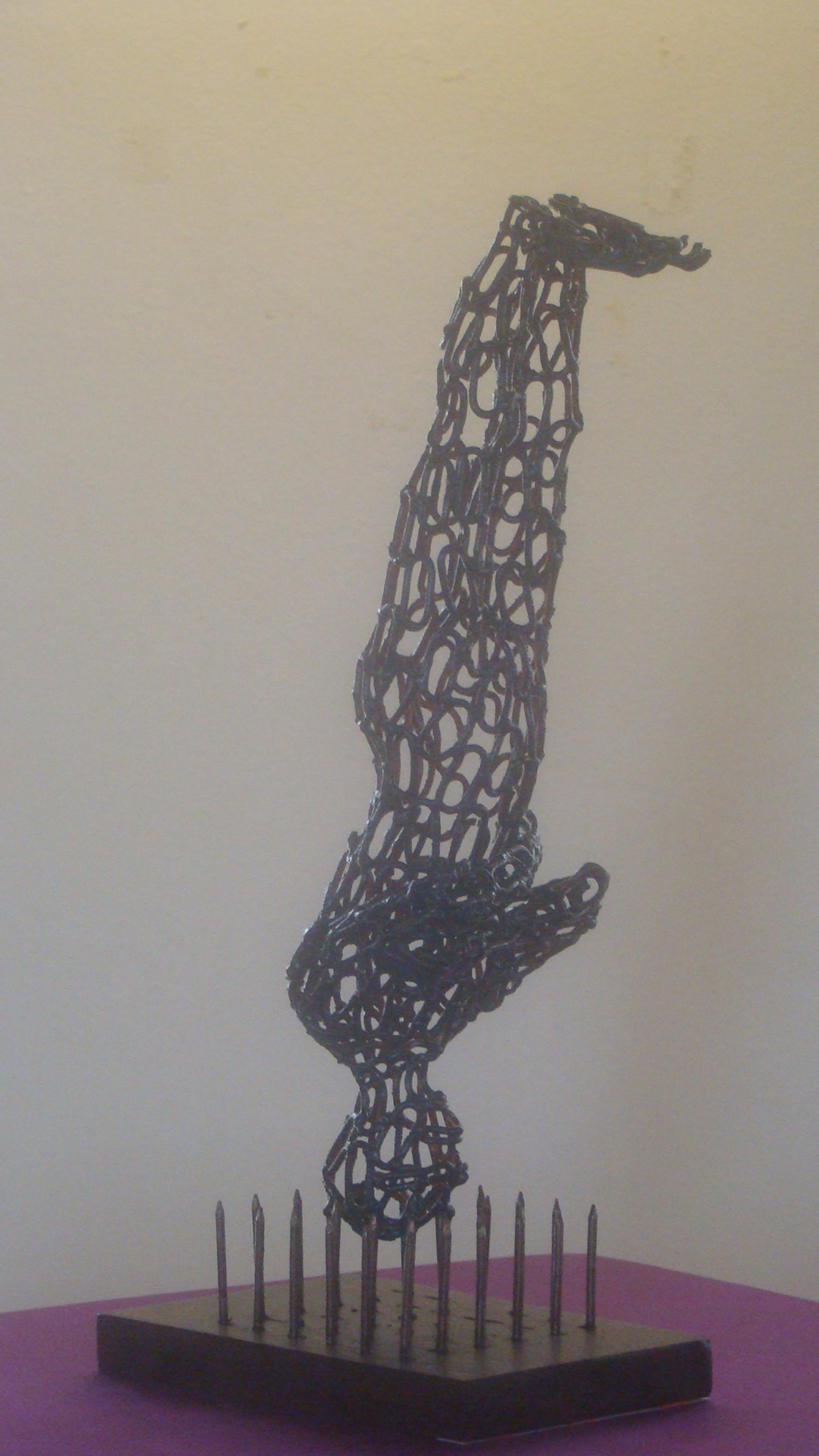 Chaque maillon de la chaîne en fer a été soudé pour prendre la forme désirée ce qui a représenté un travail colossal, cependant, l’artiste précise : “j’avais ce projet d’exposition pour “positiver” la chaîne, depuis un an. Mes idées étaient claires dans ma tête alors, en janvier dernier, j’ai commencé la réalisation des sculptures, cela m’a pris six mois”.