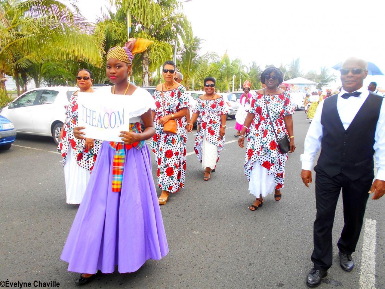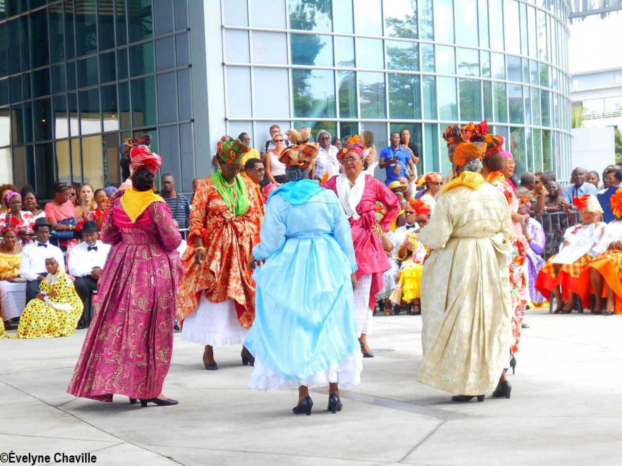 Ce dimanche, le spectacle intitulé “Rakontaj a Kostim” (Récit du Costume) et offert par l’Akadémiduka était magnifique. Pendant plus d’une heure, l’histoire des différents costumes créoles guadeloupéens a été racontée à travers plusieurs scénettes. Les membres féminins de l’association culturelle vêtues de robes d’antan ont interprété avec beaucoup de talent leurs rôles : la vendeuse du marché, la femme qui a fini vieille fille pour avoir refusé tous les prétendants, la veuve joyeuse, la femme coquette, la mulâtresse avec son ombrelle pour que sa peau reste claire, l’épouse enceinte d’un mari volage, la “Da” qui porte le bébé, la marraine, la femme qui vend ses charmes, la grande bourgeoise qui a besoin de plusieurs servantes pour la vêtir etc. Chacune de ces femmes portait à l’époque une tenue en relation avec sa position sociale assortie de bijoux et d’une coiffe.