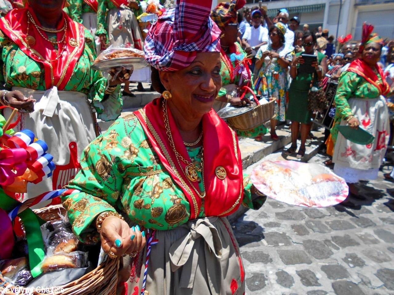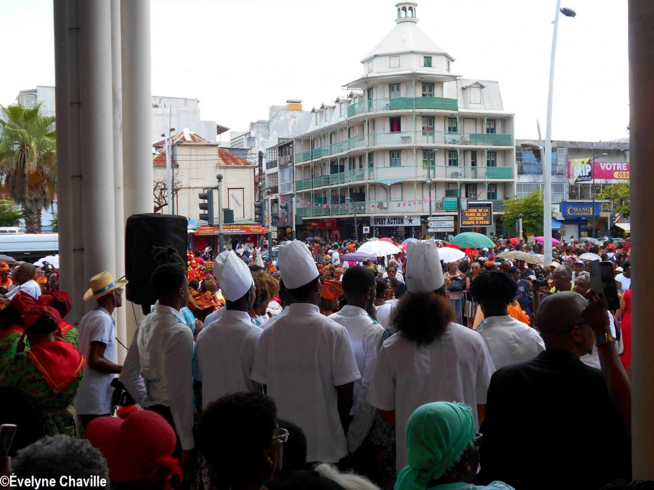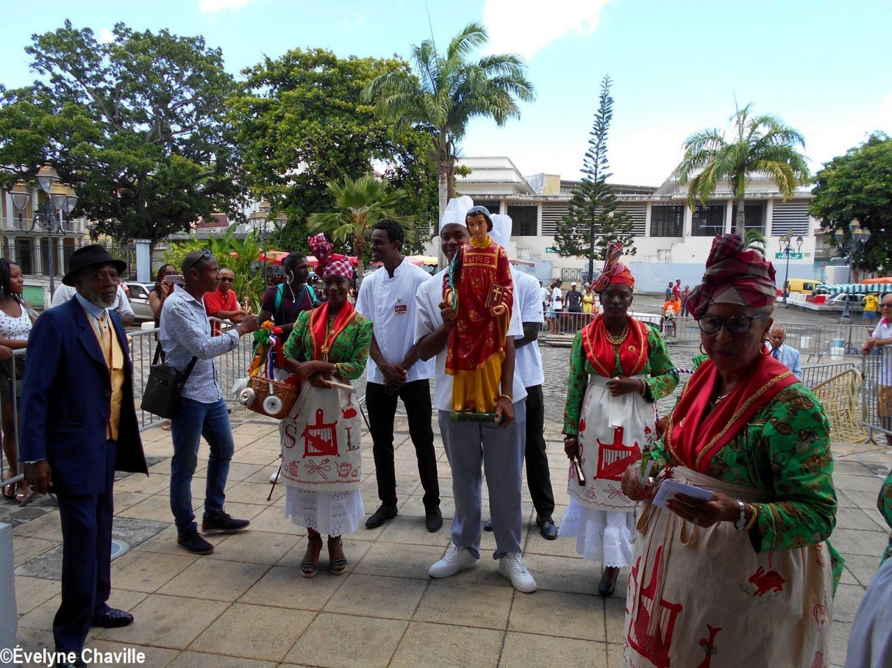 Presque deux heures plus tard, tout ce beau monde a quitté l’église pour défiler dans les rues de Pointe-à-Pitre. Mais auparavant, les Cuisinières ont distribué à la foule composée de Guadeloupéens et de touristes des petits gâteaux traditionnels qui avaient été bénis par le prêtre au cours de la cérémonie religieuse. Comme l’an dernier, le cortège a fait une halte au rez-de-chaussée du Centre René Nithila pour danser du gwoka avant de se diriger vers le gymnase Paul Chonchon où avait lieu le banquet des Cuisinières.