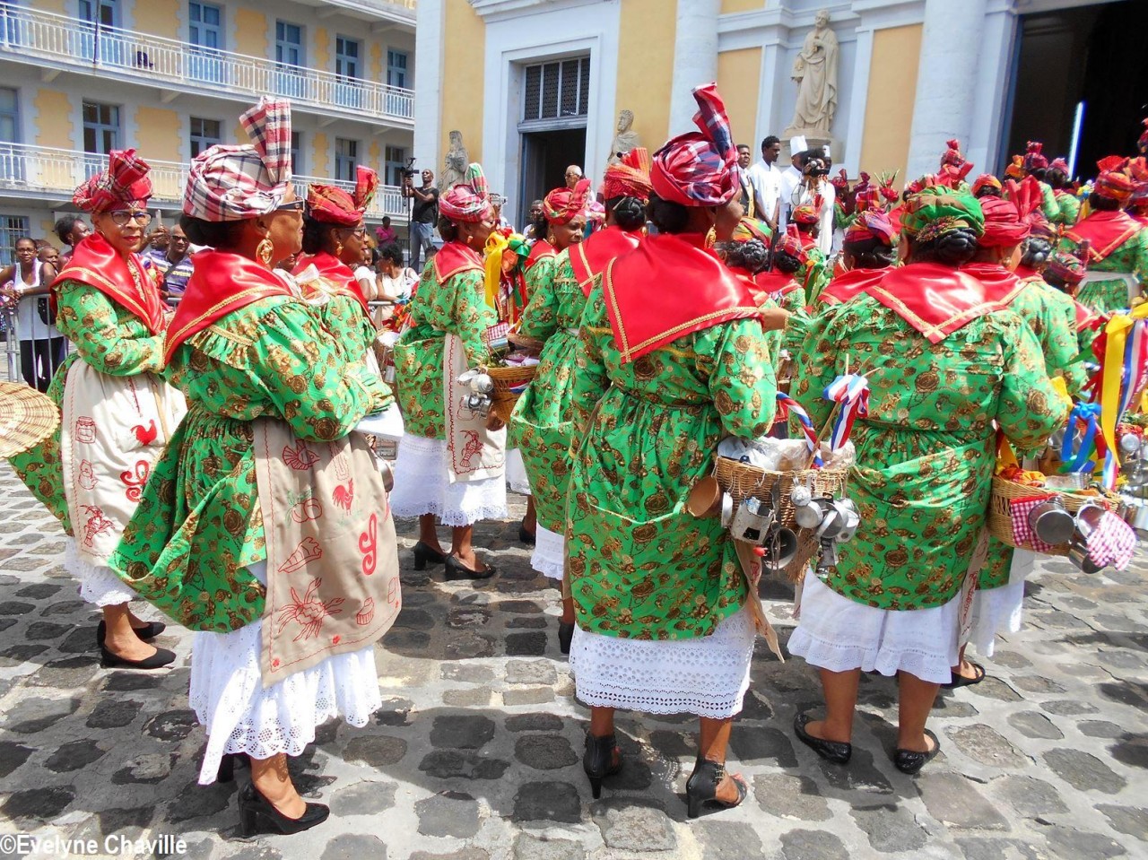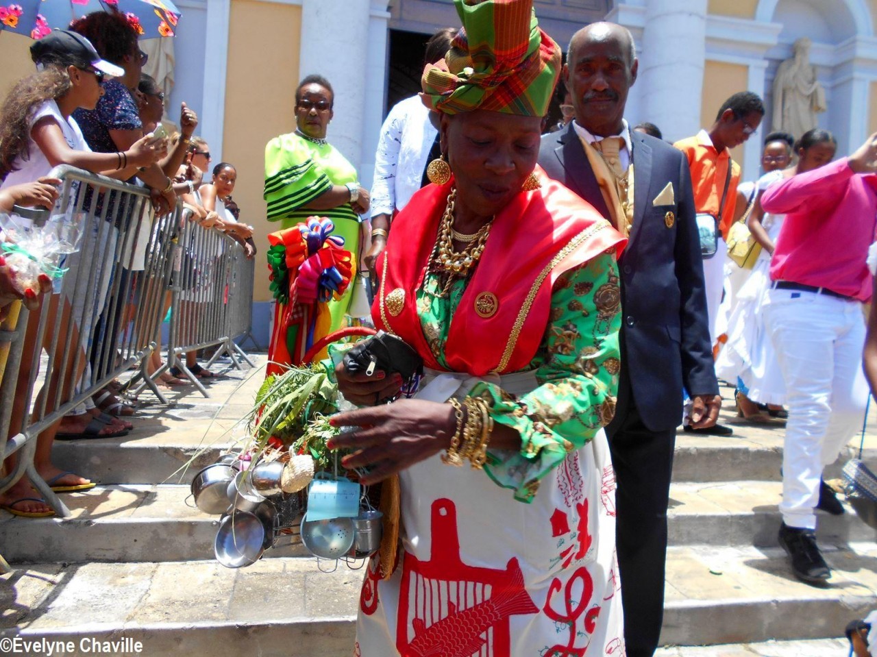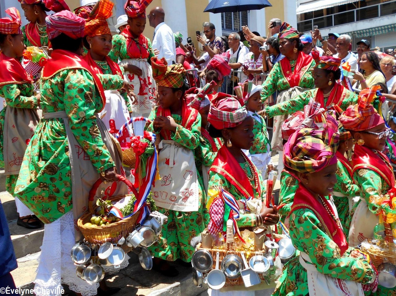 Presque deux heures plus tard, tout ce beau monde a quitté l’église pour défiler dans les rues de Pointe-à-Pitre. Mais auparavant, les Cuisinières ont distribué à la foule composée de Guadeloupéens et de touristes des petits gâteaux traditionnels qui avaient été bénis par le prêtre au cours de la cérémonie religieuse. Comme l’an dernier, le cortège a fait une halte au rez-de-chaussée du Centre René Nithila pour danser du gwoka avant de se diriger vers le gymnase Paul Chonchon où avait lieu le banquet des Cuisinières.