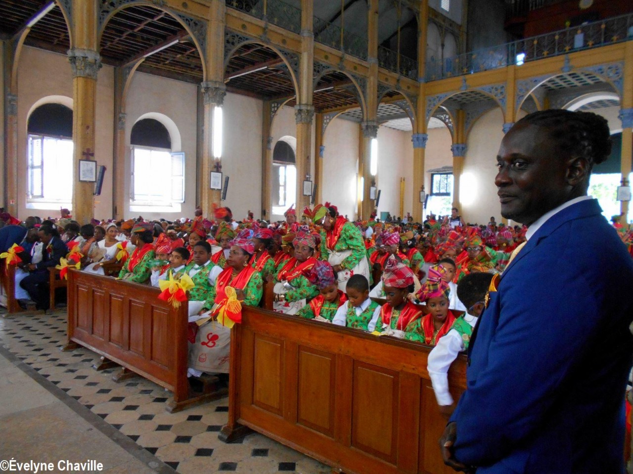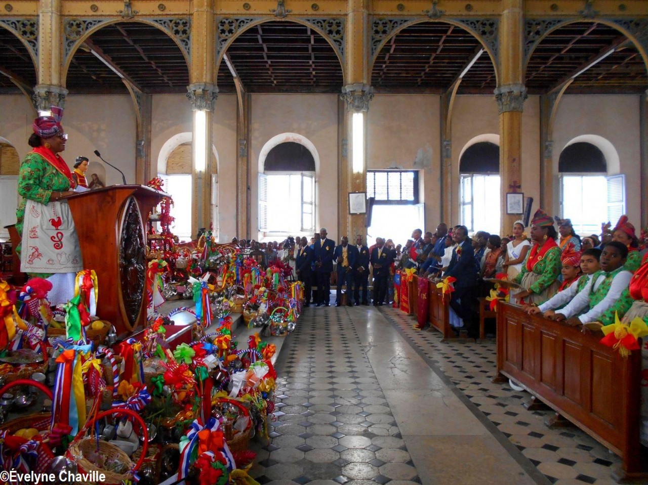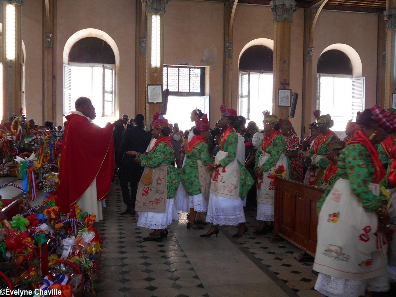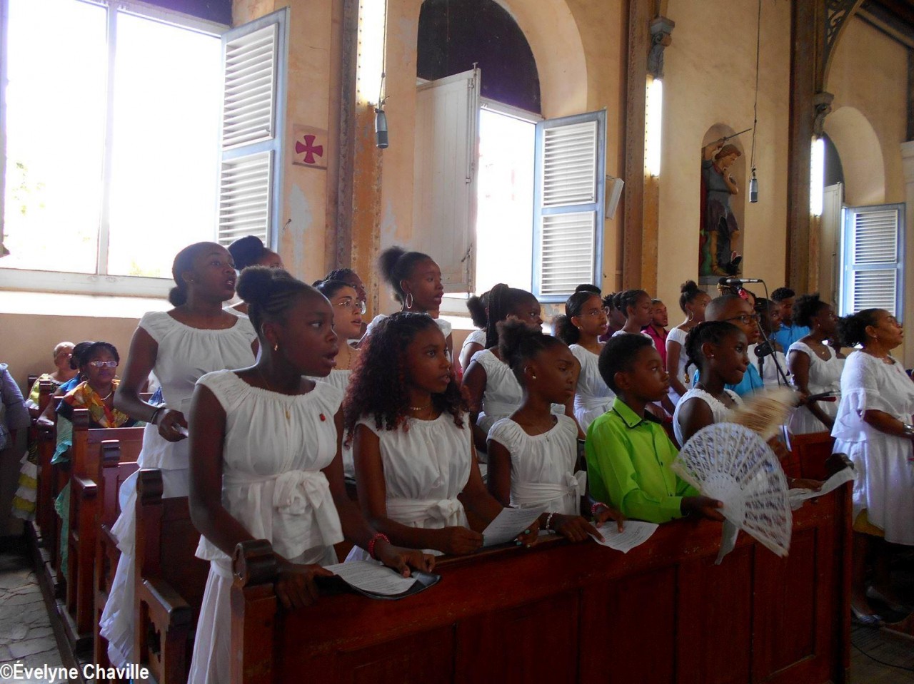 Le cortège est arrivé à l’église Saint-Pierre et Saint-Paul avant 10h00 pour la célébration de la messe. Comme chaque année, ces dames portaient leurs magnifiques robes créoles avec leurs indispensables tabliers brodés et paniers garnis ainsi que leurs bijoux créoles ; les messieurs qui ne sont pas nombreux étaient également très élégants dans leurs costumes bleus ; quant aux enfants qui représentent la relève, ils avaient été habillés avec goût.