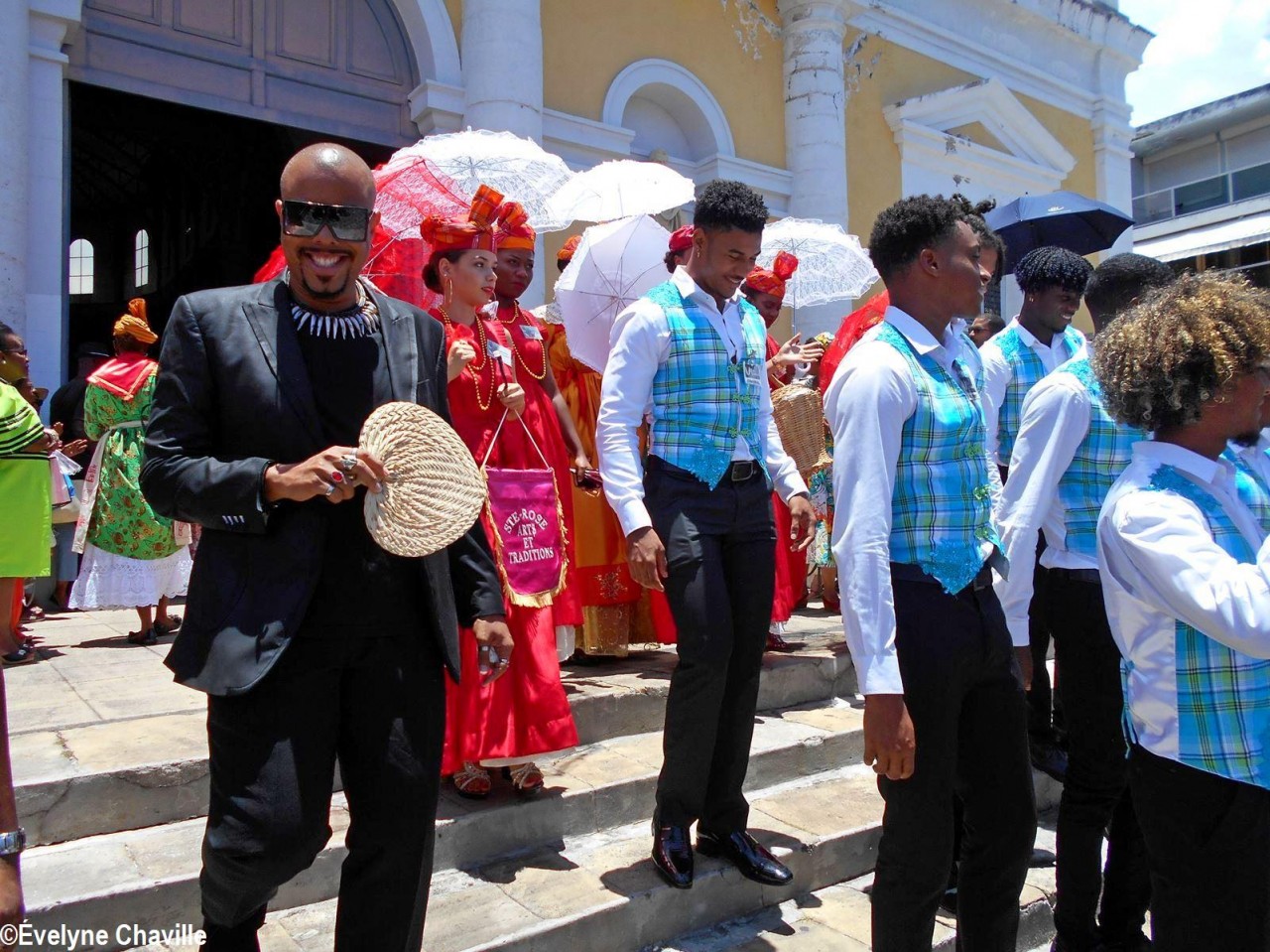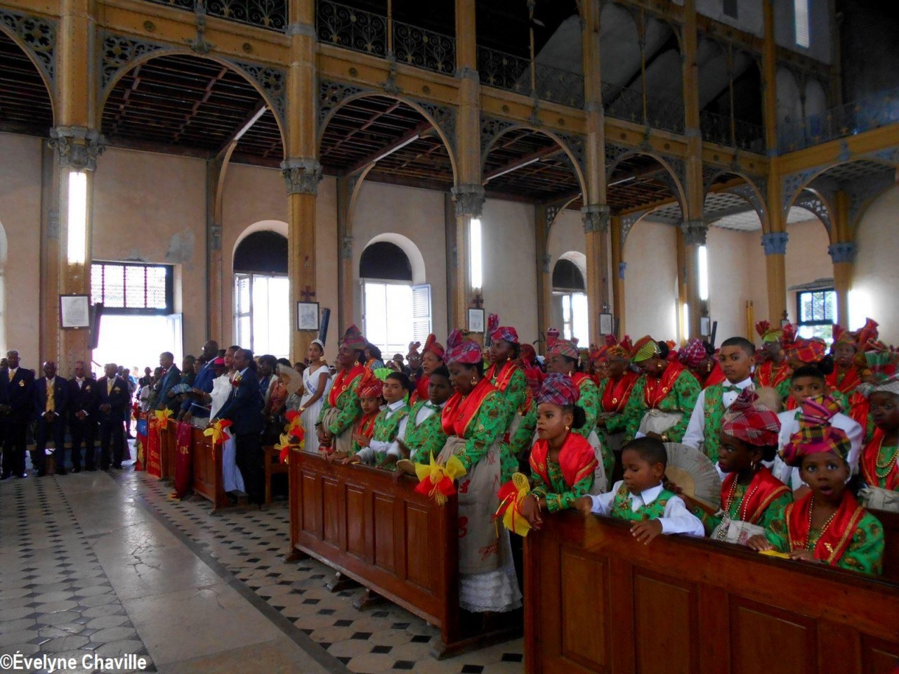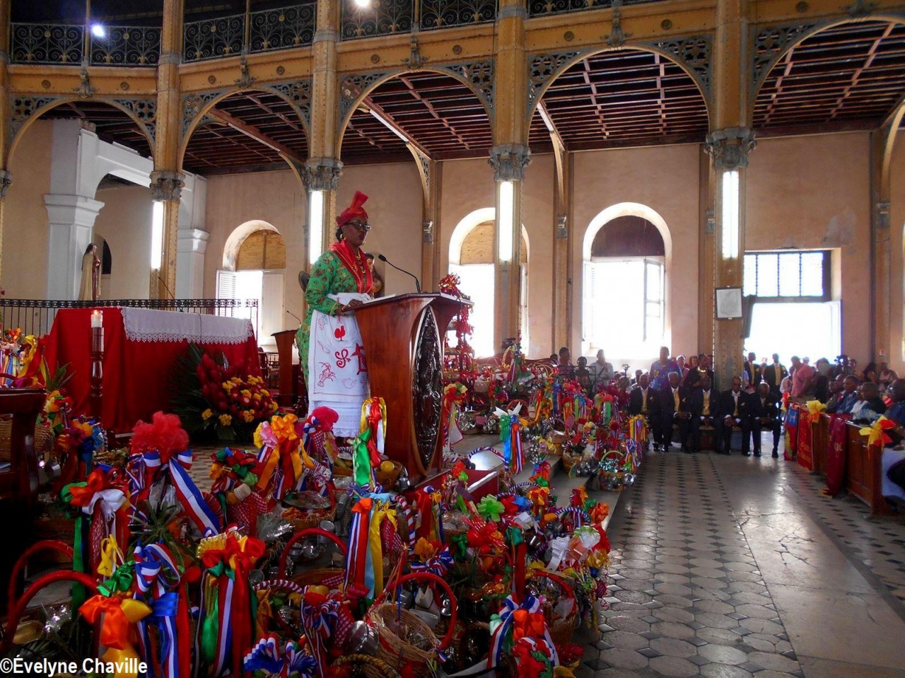 Le cortège est arrivé à l’église Saint-Pierre et Saint-Paul avant 10h00 pour la célébration de la messe. Comme chaque année, ces dames portaient leurs magnifiques robes créoles avec leurs indispensables tabliers brodés et paniers garnis ainsi que leurs bijoux créoles ; les messieurs qui ne sont pas nombreux étaient également très élégants dans leurs costumes bleus ; quant aux enfants qui représentent la relève, ils avaient été habillés avec goût.