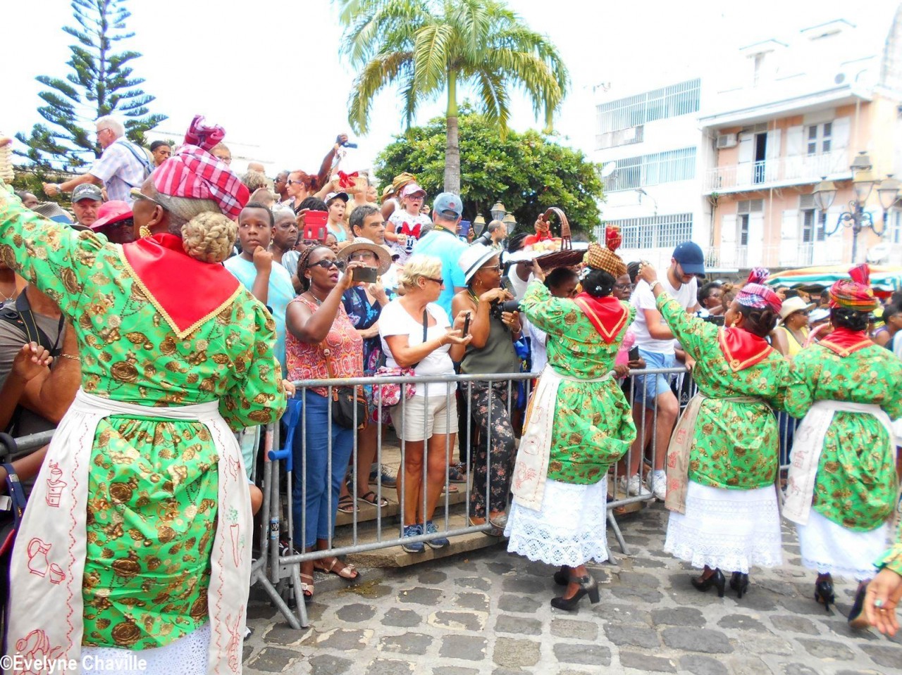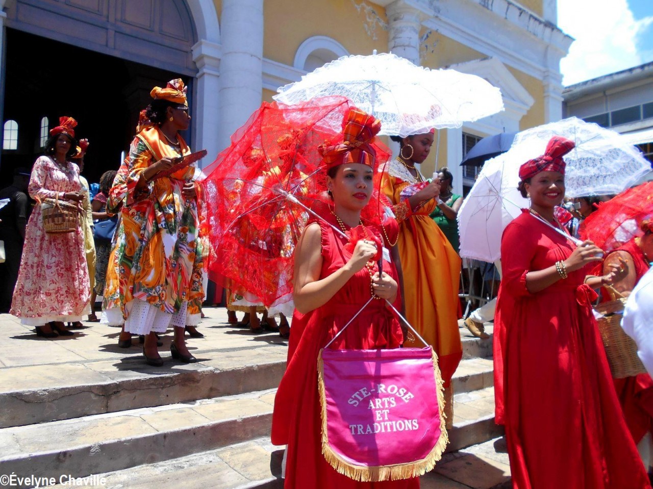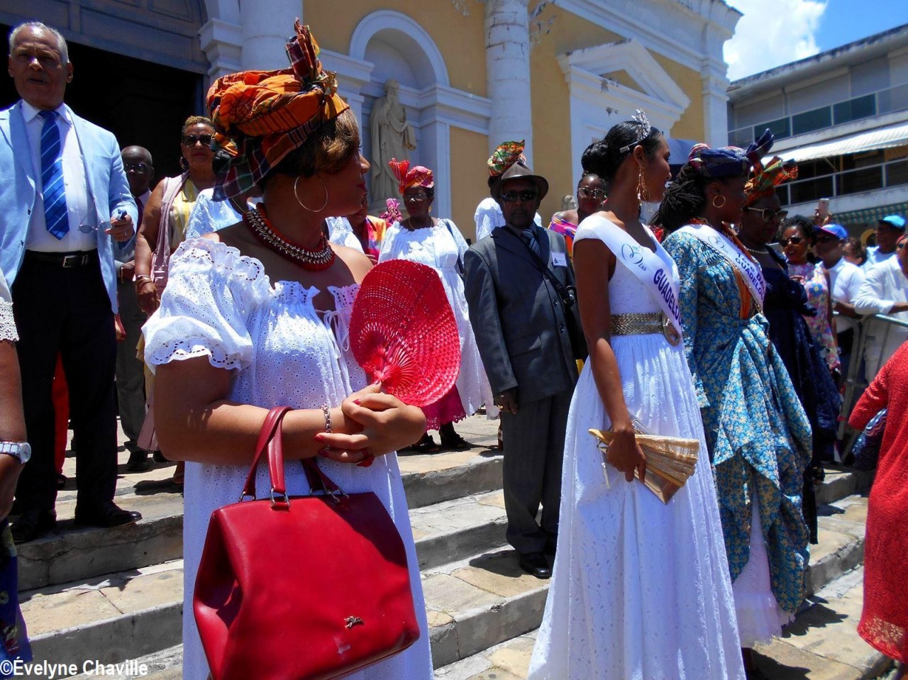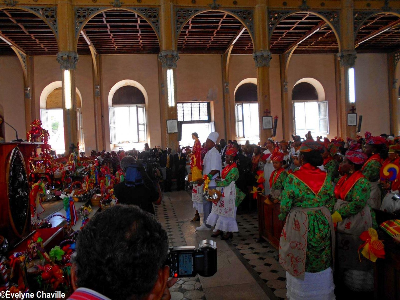 Le cortège est arrivé à l’église Saint-Pierre et Saint-Paul avant 10h00 pour la célébration de la messe. Comme chaque année, ces dames portaient leurs magnifiques robes créoles avec leurs indispensables tabliers brodés et paniers garnis ainsi que leurs bijoux créoles ; les messieurs qui ne sont pas nombreux étaient également très élégants dans leurs costumes bleus ; quant aux enfants qui représentent la relève, ils avaient été habillés avec goût.