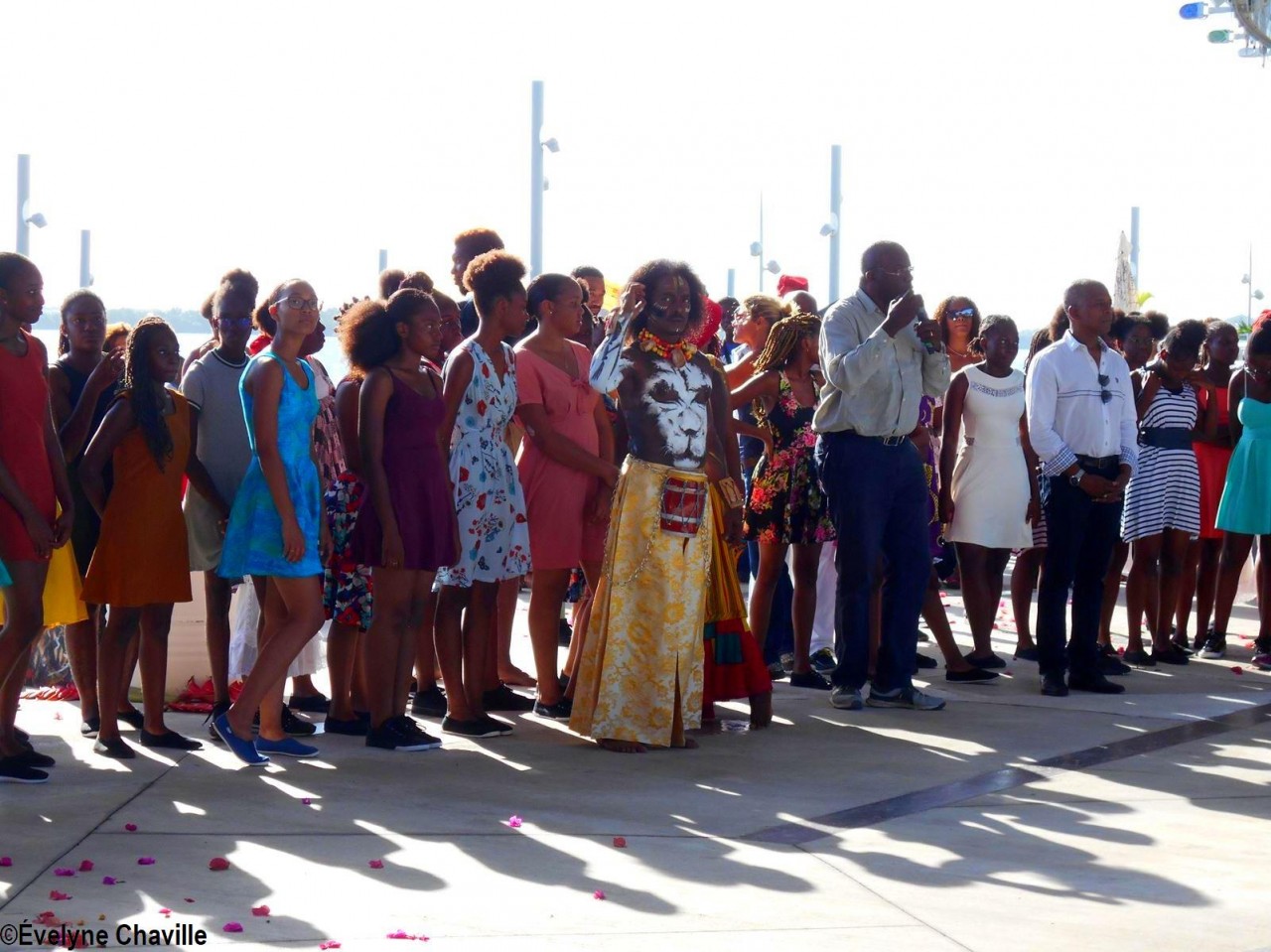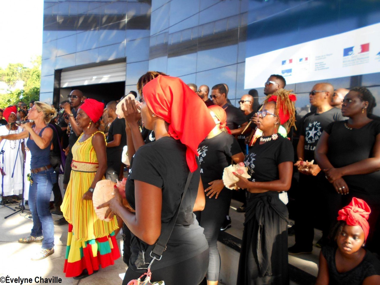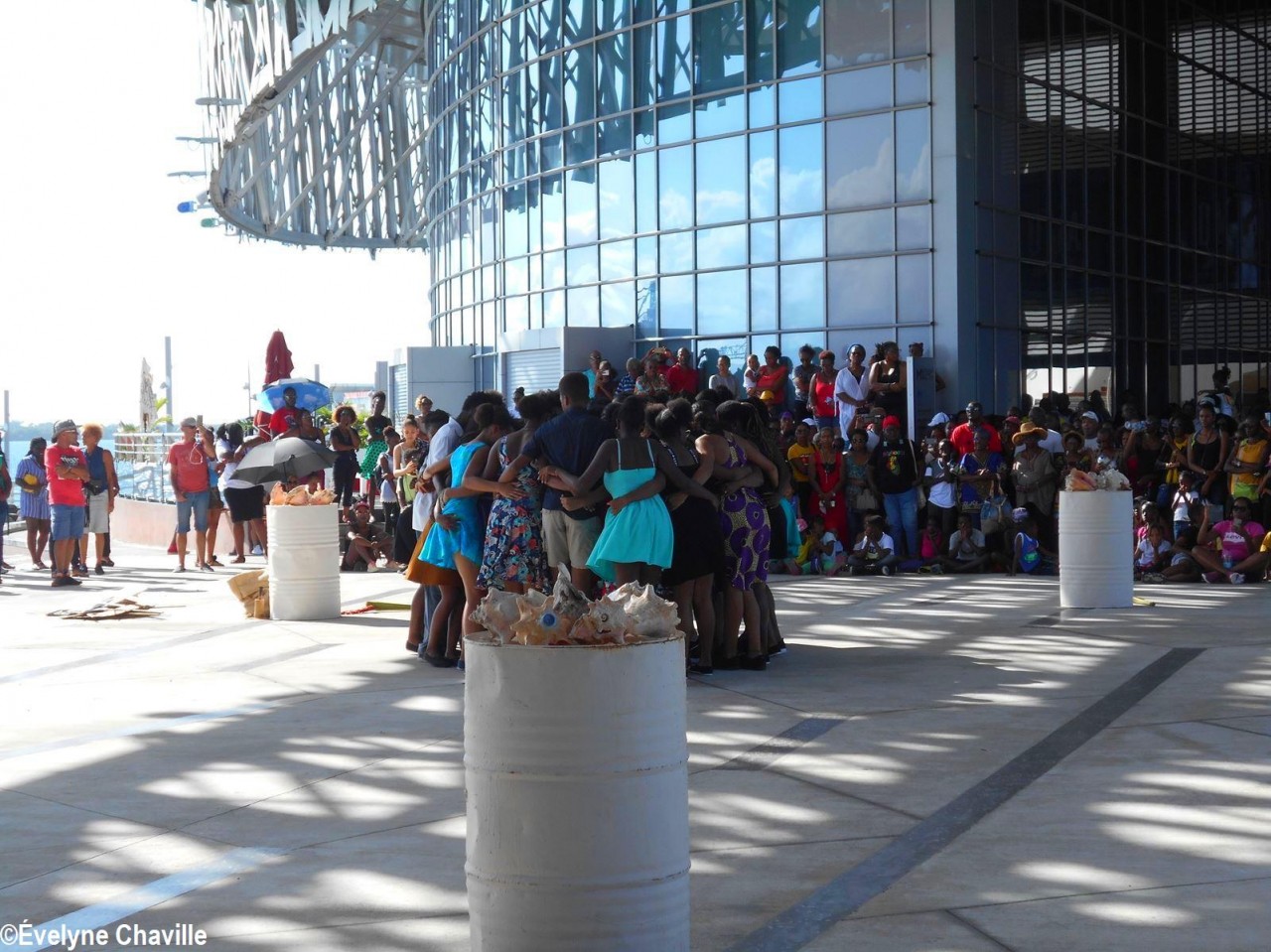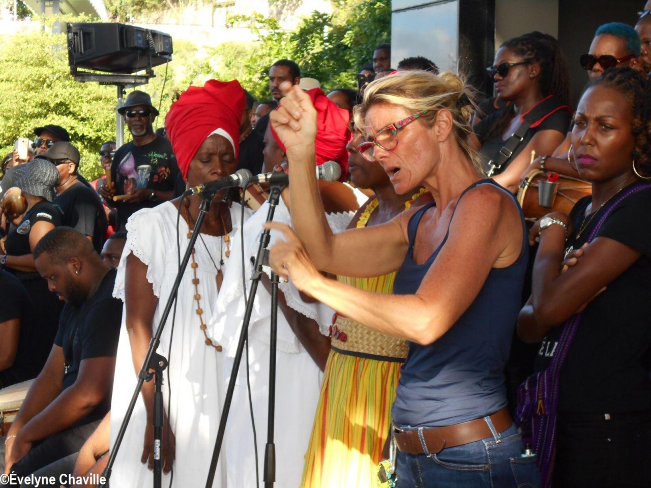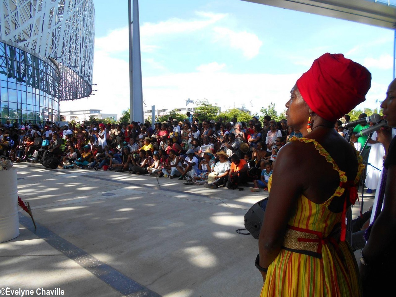 Cette fresque historique, créée par la chorégraphe guadeloupéenne Raymonde Pater Torin, a débuté à 15h00 sur la Place de la Victoire, là où les premiers coups de feu ont été tirés il y a aujourd’hui 52 ans, puis le cortège s’est dirigé vers le MACTe au son des tambours et des conques de lambi. Le spectacle s’est poursuivi jusqu’à 17h30 sur la grande Place de la Commémoration devant un public très attentif composé, entre autres, de personnes ayant vécu ce fait sanglant et de jeunes qui ont découvert ce massacre de mai 1967 qui est toujours entouré de nombreux mystères (nombre exact de morts, noms des personnes tuées etc.) dû notamment au mutisme et à la peur de la population à cette époque… La foule a été invitée à lancer à la mer des fleurs en mémoire des ancêtres esclaves et des victimes de 1967. Pour terminer, les spectateurs se sont joints aux musiciens et acteurs pour effectuer un défilé sur le site…