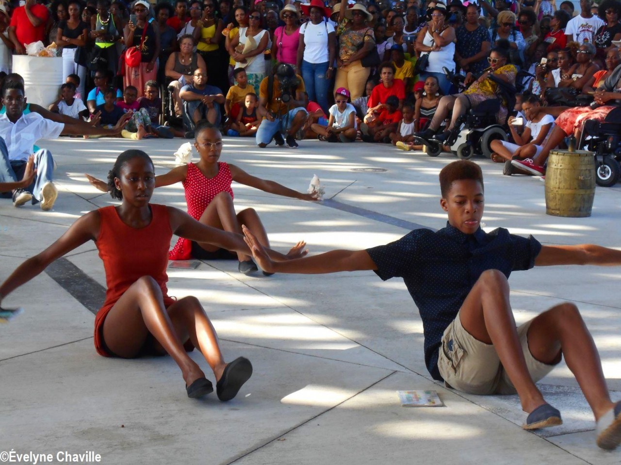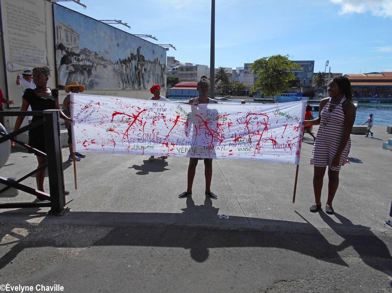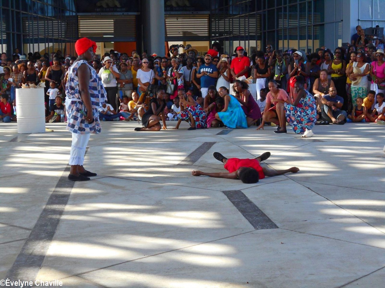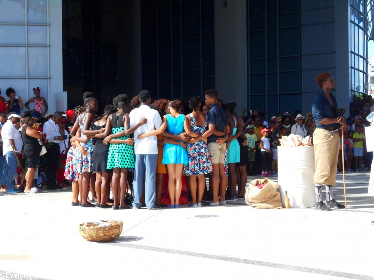 Cette fresque historique, créée par la chorégraphe guadeloupéenne Raymonde Pater Torin, a débuté à 15h00 sur la Place de la Victoire, là où les premiers coups de feu ont été tirés il y a aujourd’hui 52 ans, puis le cortège s’est dirigé vers le MACTe au son des tambours et des conques de lambi. Le spectacle s’est poursuivi jusqu’à 17h30 sur la grande Place de la Commémoration devant un public très attentif composé, entre autres, de personnes ayant vécu ce fait sanglant et de jeunes qui ont découvert ce massacre de mai 1967 qui est toujours entouré de nombreux mystères (nombre exact de morts, noms des personnes tuées etc.) dû notamment au mutisme et à la peur de la population à cette époque… La foule a été invitée à lancer à la mer des fleurs en mémoire des ancêtres esclaves et des victimes de 1967. Pour terminer, les spectateurs se sont joints aux musiciens et acteurs pour effectuer un défilé sur le site…