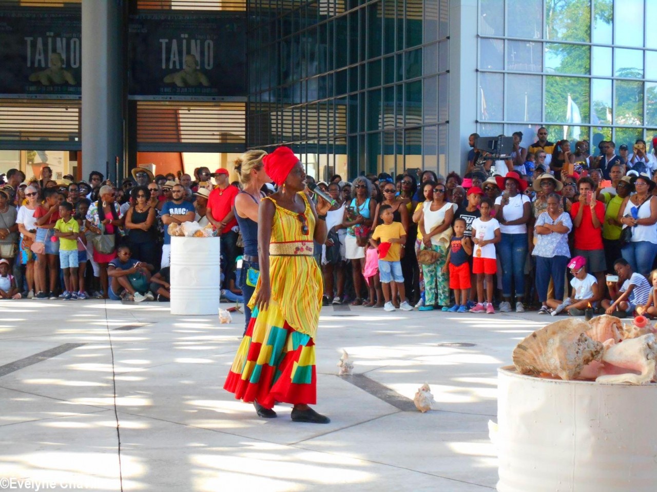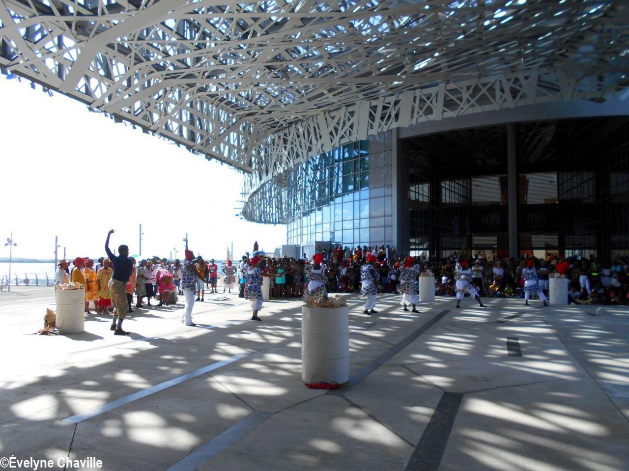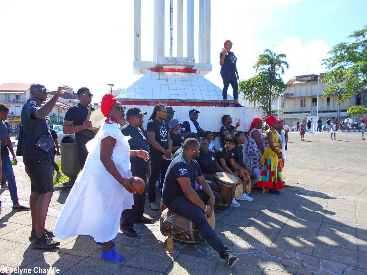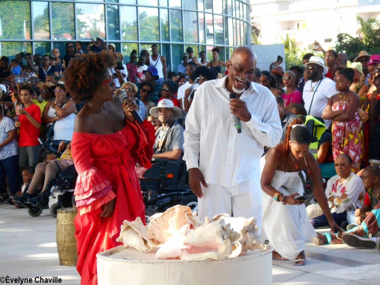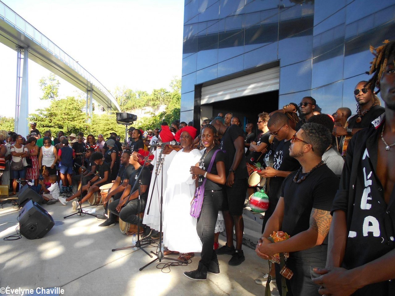 Cette fresque historique, créée par la chorégraphe guadeloupéenne Raymonde Pater Torin, a débuté à 15h00 sur la Place de la Victoire, là où les premiers coups de feu ont été tirés il y a aujourd’hui 52 ans, puis le cortège s’est dirigé vers le MACTe au son des tambours et des conques de lambi. Le spectacle s’est poursuivi jusqu’à 17h30 sur la grande Place de la Commémoration devant un public très attentif composé, entre autres, de personnes ayant vécu ce fait sanglant et de jeunes qui ont découvert ce massacre de mai 1967 qui est toujours entouré de nombreux mystères (nombre exact de morts, noms des personnes tuées etc.) dû notamment au mutisme et à la peur de la population à cette époque… La foule a été invitée à lancer à la mer des fleurs en mémoire des ancêtres esclaves et des victimes de 1967. Pour terminer, les spectateurs se sont joints aux musiciens et acteurs pour effectuer un défilé sur le site…