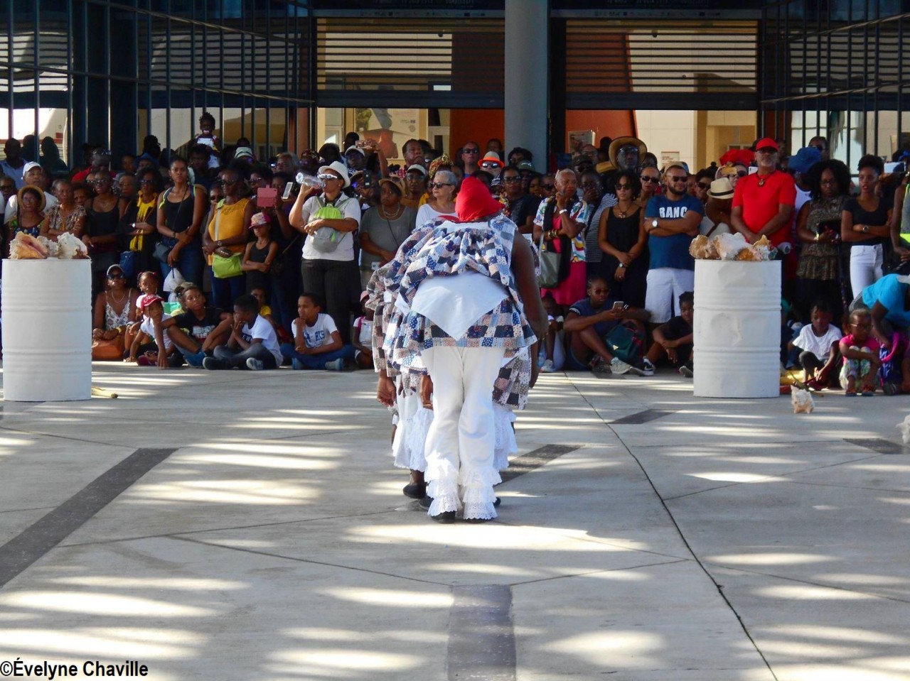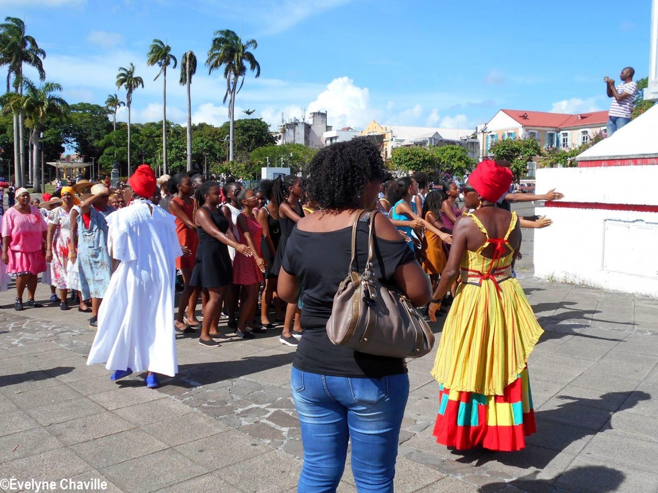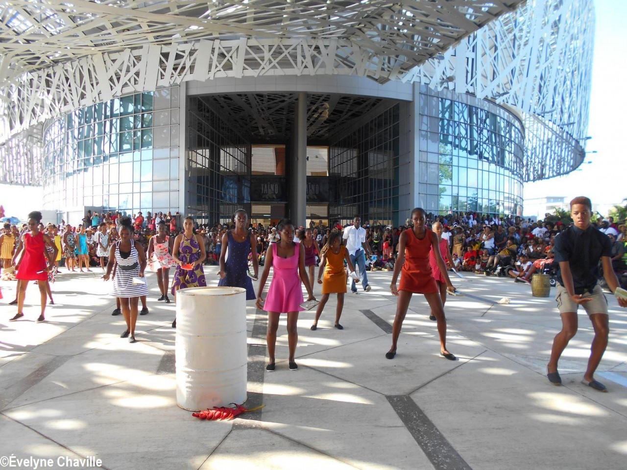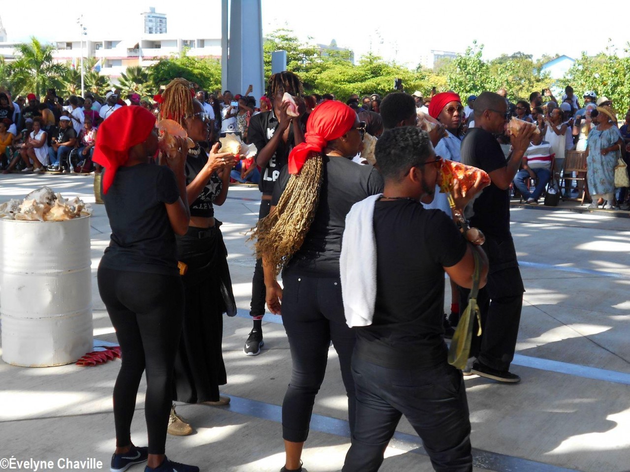 Cette fresque historique, créée par la chorégraphe guadeloupéenne Raymonde Pater Torin, a débuté à 15h00 sur la Place de la Victoire, là où les premiers coups de feu ont été tirés il y a aujourd’hui 52 ans, puis le cortège s’est dirigé vers le MACTe au son des tambours et des conques de lambi. Le spectacle s’est poursuivi jusqu’à 17h30 sur la grande Place de la Commémoration devant un public très attentif composé, entre autres, de personnes ayant vécu ce fait sanglant et de jeunes qui ont découvert ce massacre de mai 1967 qui est toujours entouré de nombreux mystères (nombre exact de morts, noms des personnes tuées etc.) dû notamment au mutisme et à la peur de la population à cette époque… La foule a été invitée à lancer à la mer des fleurs en mémoire des ancêtres esclaves et des victimes de 1967. Pour terminer, les spectateurs se sont joints aux musiciens et acteurs pour effectuer un défilé sur le site…