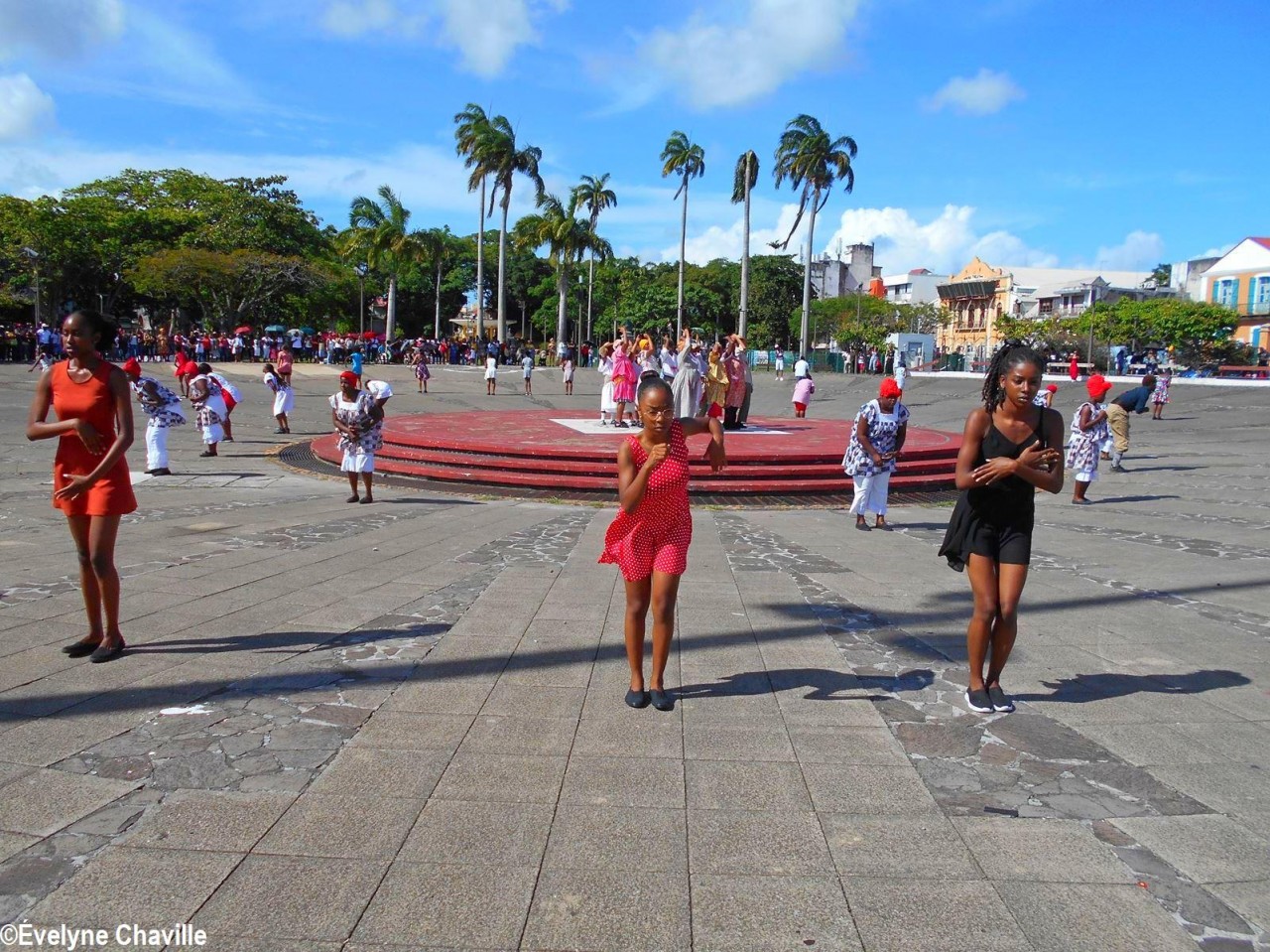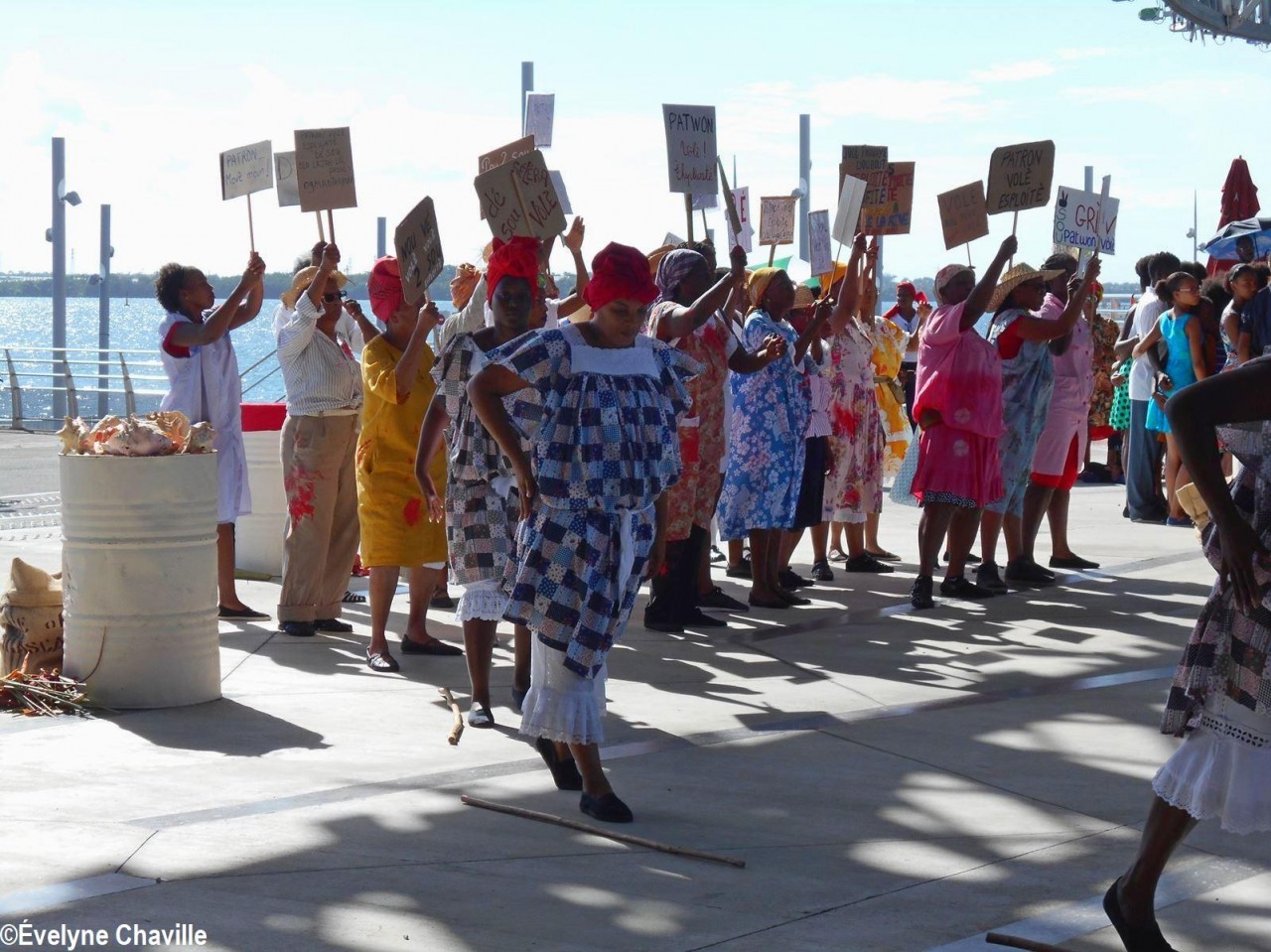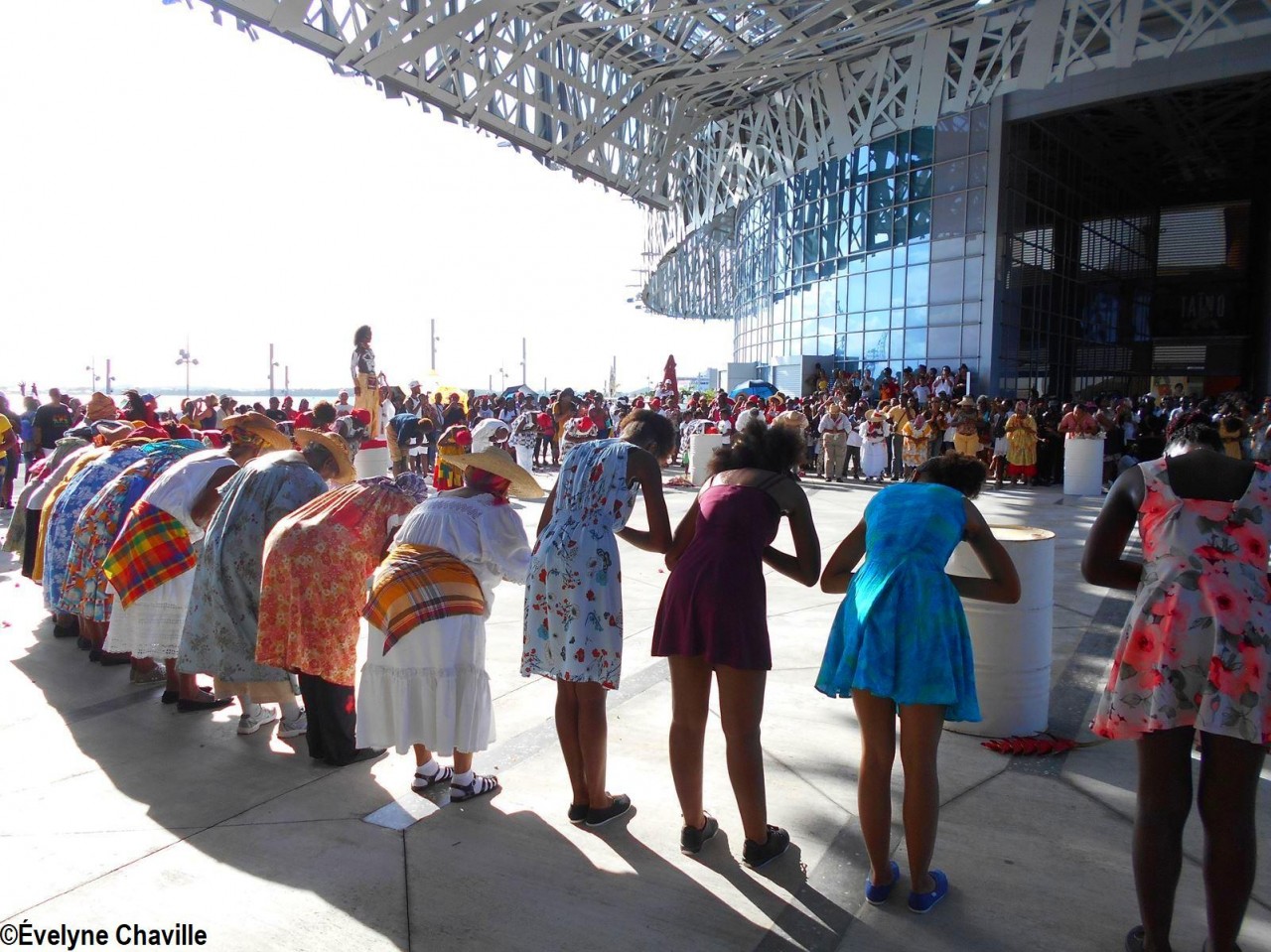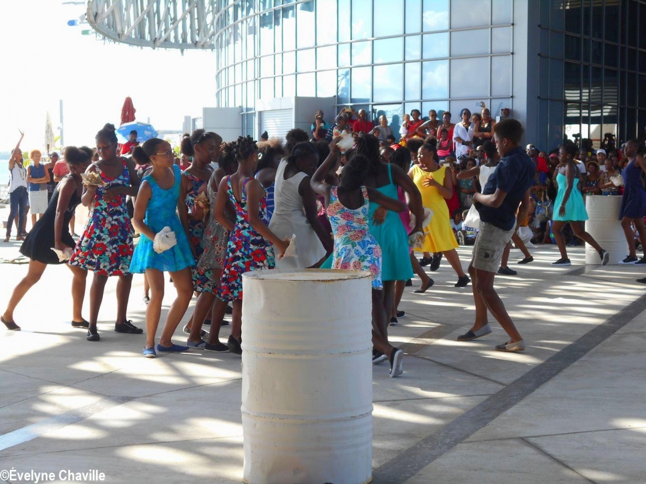 Cette fresque historique, créée par la chorégraphe guadeloupéenne Raymonde Pater Torin, a débuté à 15h00 sur la Place de la Victoire, là où les premiers coups de feu ont été tirés il y a aujourd’hui 52 ans, puis le cortège s’est dirigé vers le MACTe au son des tambours et des conques de lambi. Le spectacle s’est poursuivi jusqu’à 17h30 sur la grande Place de la Commémoration devant un public très attentif composé, entre autres, de personnes ayant vécu ce fait sanglant et de jeunes qui ont découvert ce massacre de mai 1967 qui est toujours entouré de nombreux mystères (nombre exact de morts, noms des personnes tuées etc.) dû notamment au mutisme et à la peur de la population à cette époque… La foule a été invitée à lancer à la mer des fleurs en mémoire des ancêtres esclaves et des victimes de 1967. Pour terminer, les spectateurs se sont joints aux musiciens et acteurs pour effectuer un défilé sur le site…