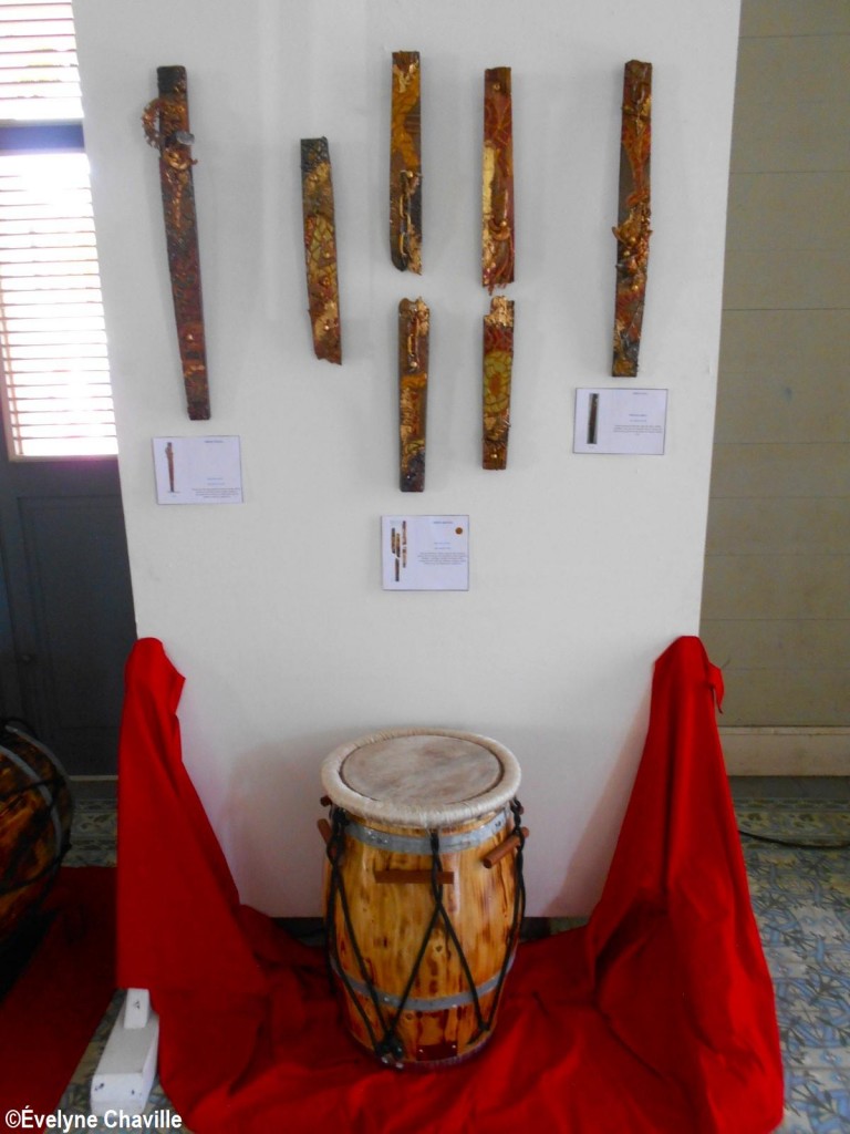 L. B. : Juste au-dessus, il y a une douelle de tonneau. Yves est tonnelier et ce tonneau était cassé donc j’ai récupéré cette douelle. Elle représente le cordage du tambour sur le plan artistique. Les douelles qui sont collées debout pour faire le tambour sont des éclats de calebasses que j’ai accrochés un à un. Il y en a 251. Si vous regardez bien (vous prenez du recul), vous regardez le tambour de face, vous ne cherchez pas à regarder le dessus, l’oeuvre c’est exactement le tambour vu de face avec ses trois cercles qui sont représentés avec le rejet du palmier royal qui a été courbé pour donner la forme. Ensuite, les “cochettes” du tambour sont représentées avec des cercles de bambou, la clé c’est un morceau de treillis soudé (des déchets de mon atelier que j’ai construit, il n’y a pas longtemps). La ficelle, c’est la fibre du bananier. Sur cette oeuvre, vous avez 7 tambours qui sont posés et qui représentent les 7 rythmes du gwo-ka. Il y a la fleur de corossol en rapport avec les effets du corossol sur la santé puisqu’on en fait des bains, des décoctions etc. C’est pour cela que je vous ai parlé du symbolisme. Le tambour c’est quelque chose qui capte, qui permet de se connecter avec des énergies qu’il y a autour, c’est quelque chose qui met de la joie. J’ai représenté les cornes avec des graines de sablier. La peau de cabri est présente car, quand Yves travaille, il y a des déchets, que vous retrouvez ici au niveau de la douelle couchée.