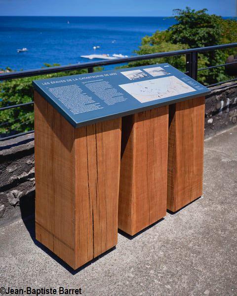 11 panneaux composent cette exposition et sont situés le long de la promenade comme des stèles rendant hommage aux victimes de ces bateaux ayant fait naufrage dans la baie de Saint-Pierre. Deux panneaux présentent le contexte historique et archéologique sous-marin, quatre panneaux présentent les épaves identifiées à ce jour (Le Tamaya, Le Roraima, Le Diamant et Le Biscaye) et cinq concernent des épaves dont l’identification n’est pas définitive.
